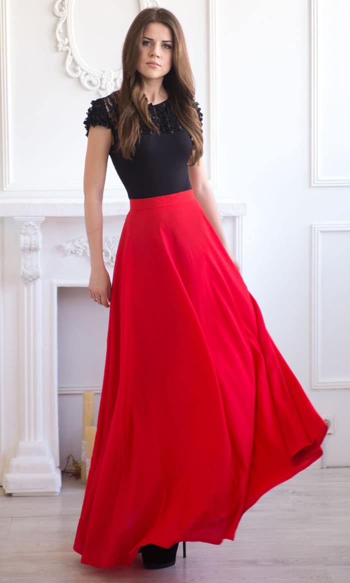 Under such skirts, it is recommended to choose a plain top, preferably dark. So that the bright, red color could open completely and your top would not overshadow it.