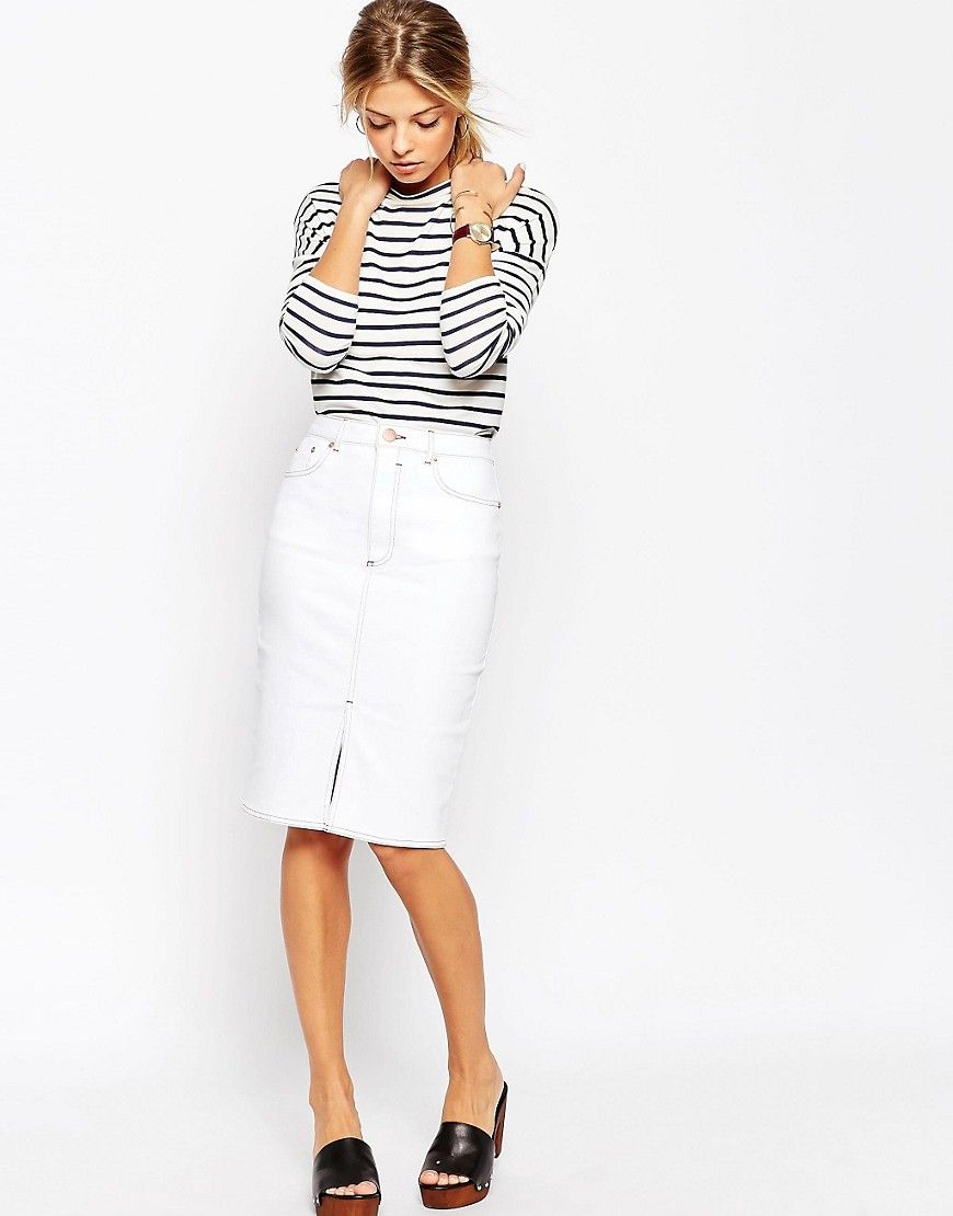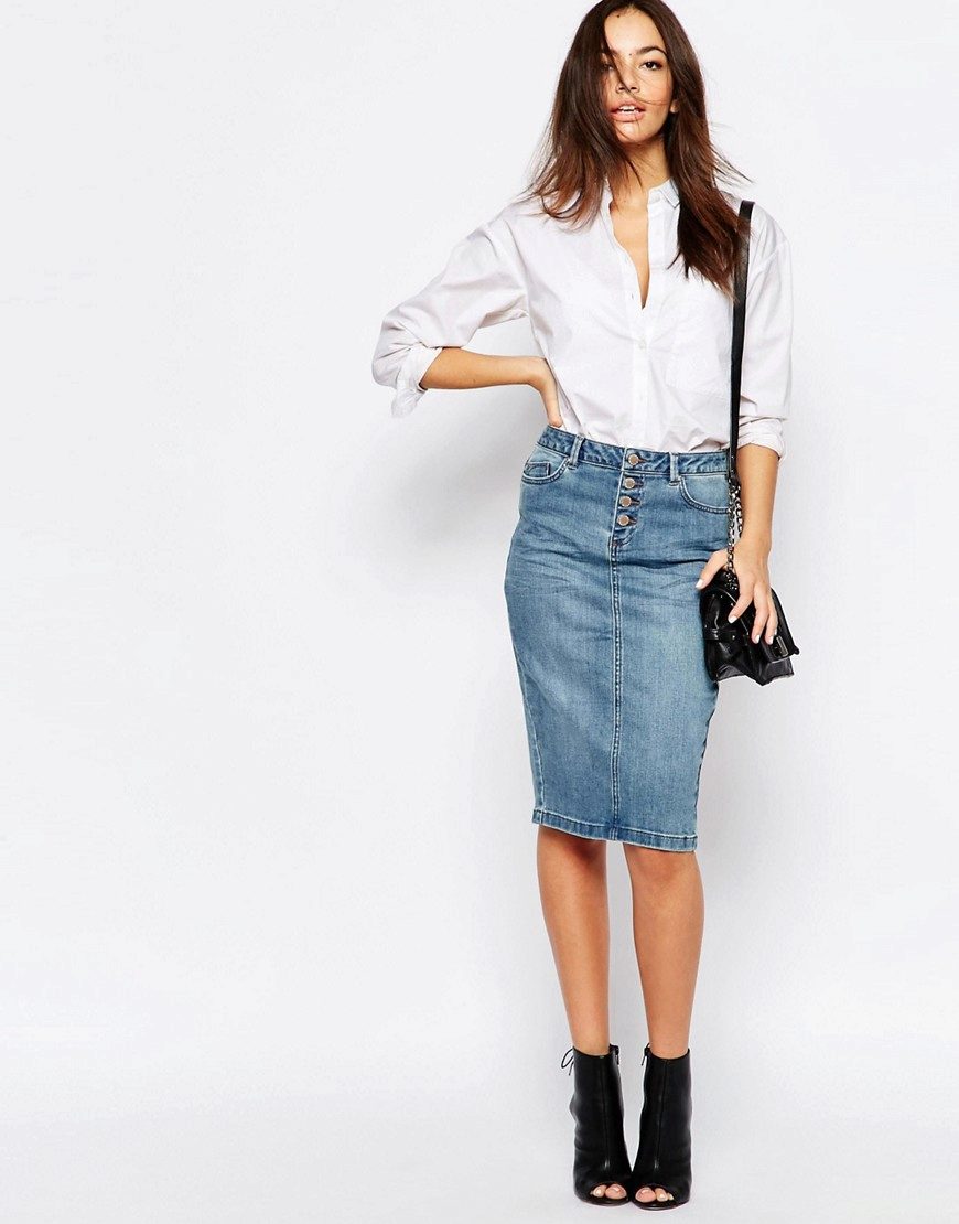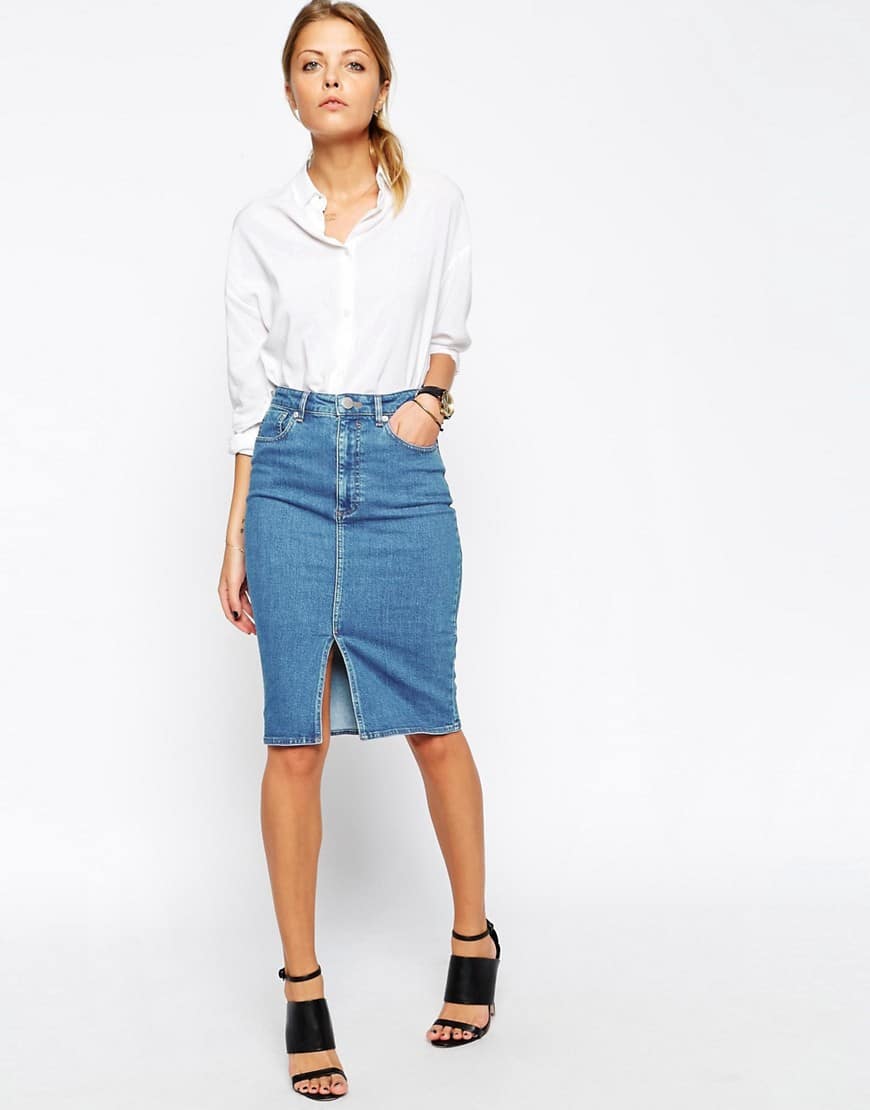 If the dress code is not particularly strict at your work, then you can easily afford a good denim pencil skirt. Pencil skirt can be of different colors. White, light blue, blue and dark blue. In any case, the color of such a skirt fits white well.