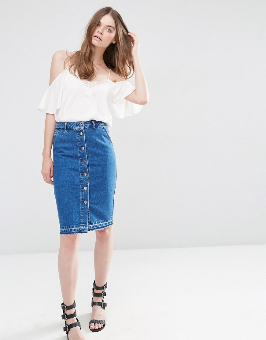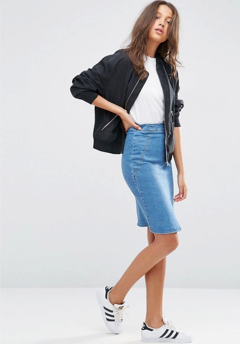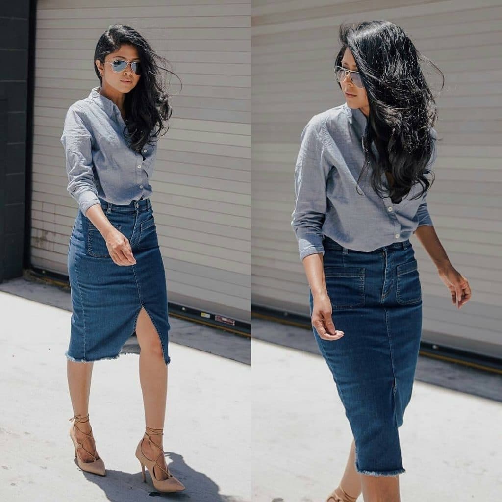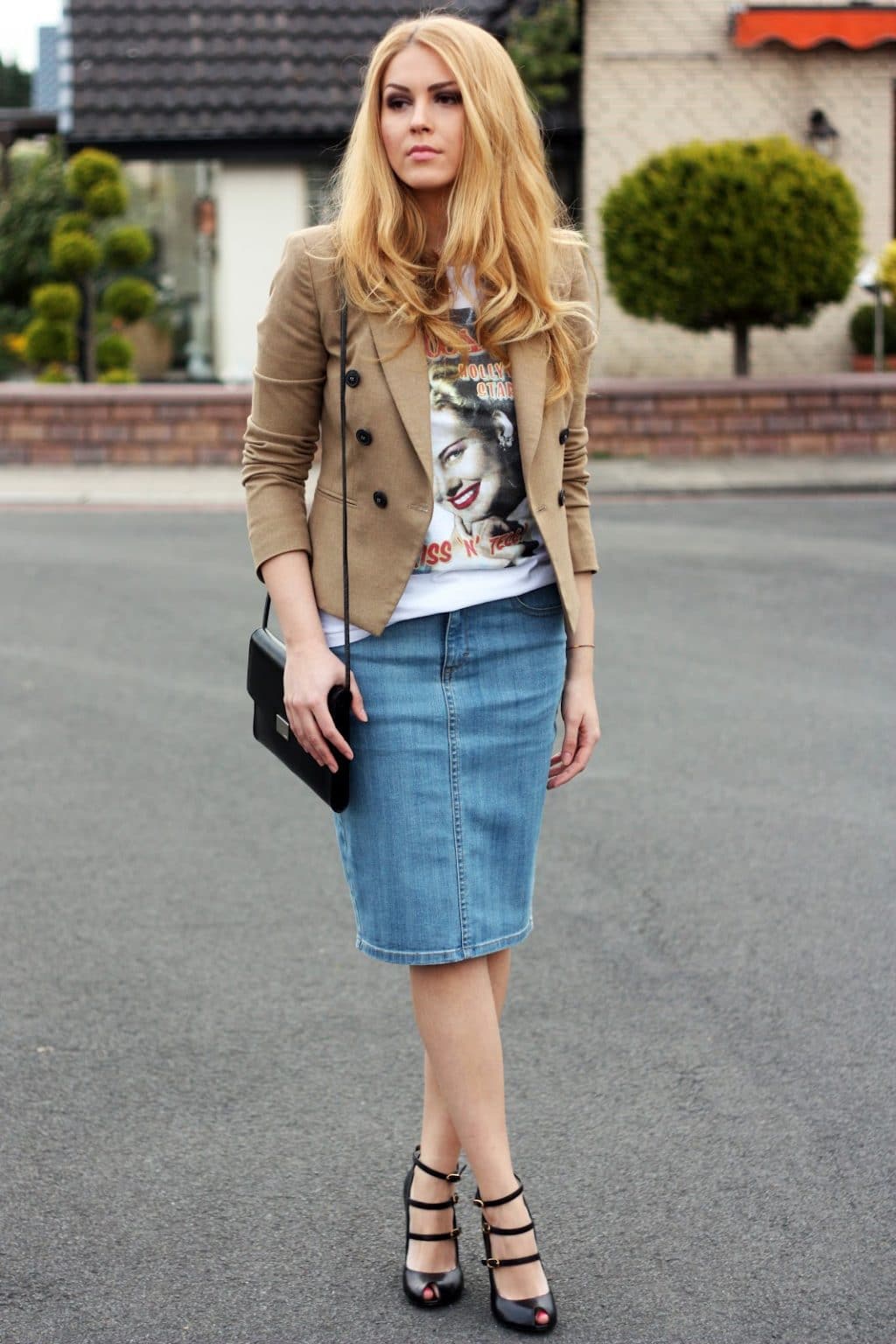 If the dress code is not particularly strict at your work, then you can easily afford a good denim pencil skirt. Pencil skirt can be of different colors. White, light blue, blue and dark blue. In any case, the color of such a skirt fits white well.