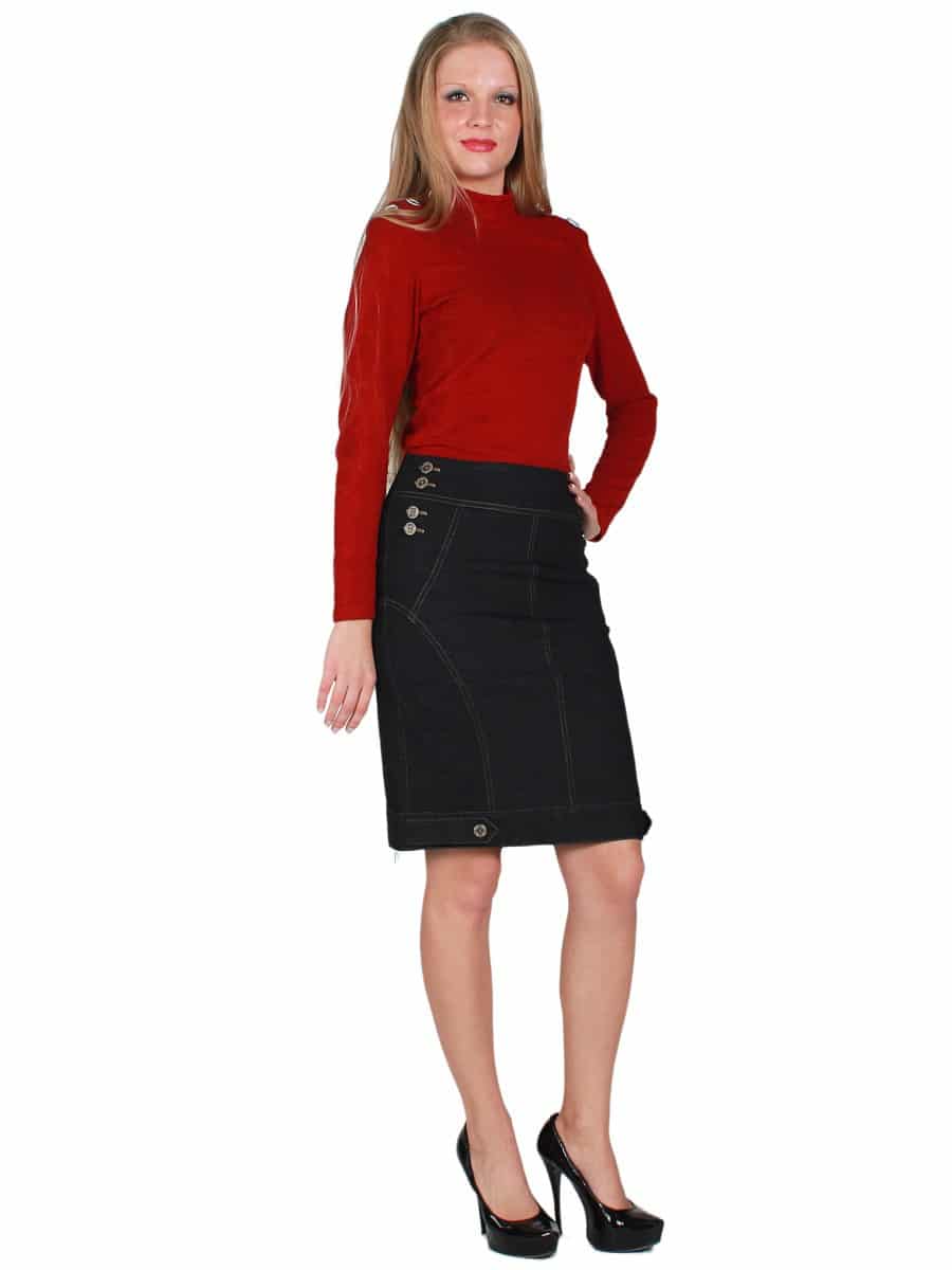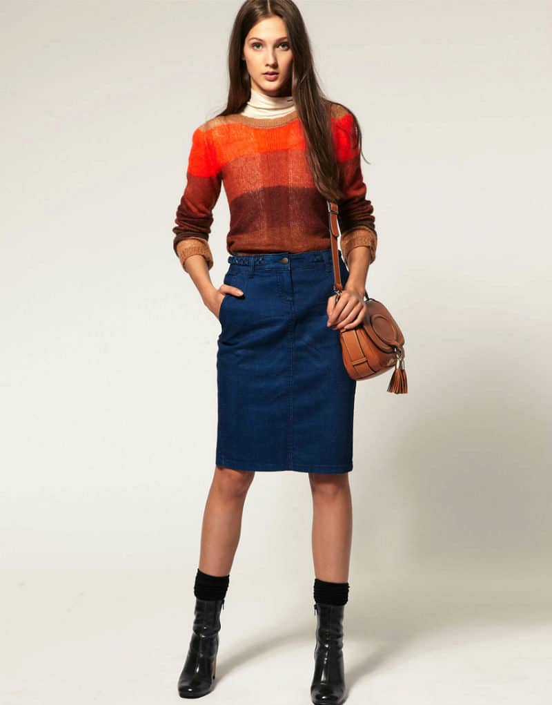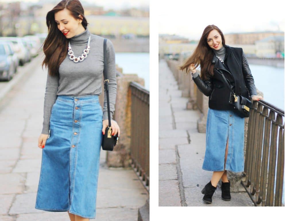 Such skirts can be worn with blouses, sweaters or a warm sweater. Unlike short skirts, a long denim skirt can also be worn in the cold season. One has only to put on a warm sweater, a jacket, and on his feet ankle boots or boots.