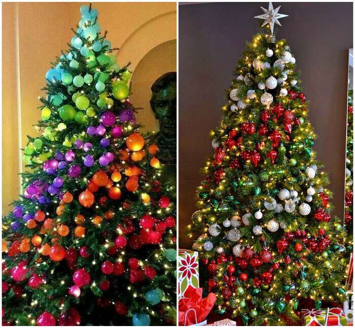 As the name implies, only 2 colors of decorations are used to decorate the Christmas tree. Colors should harmonize and complement each other perfectly. You can arrange decorations on the tree: