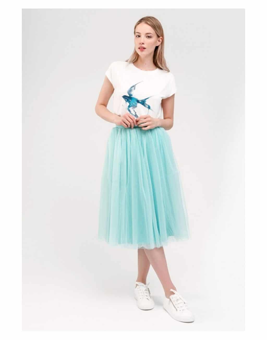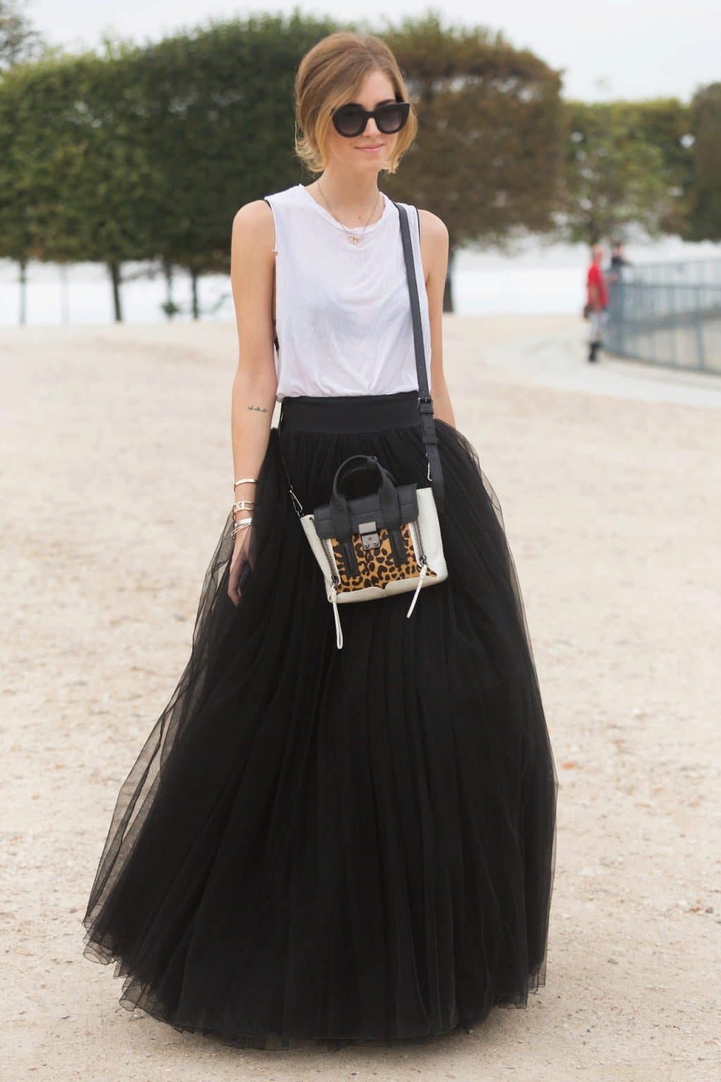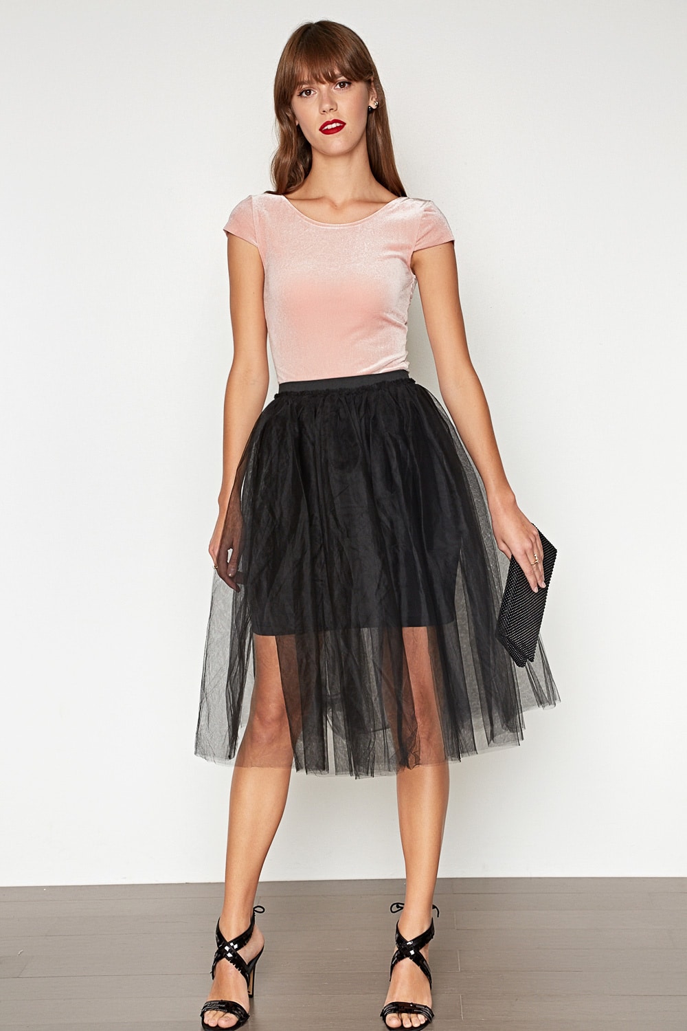 It is good to combine a tulle mini skirt with closed t-shirts or t-shirts. It is appropriate to supplement the open blouse with a jacket or jacket. An elegant medium-sized handbag and ankle boots or closed heel shoes will balance the look.
