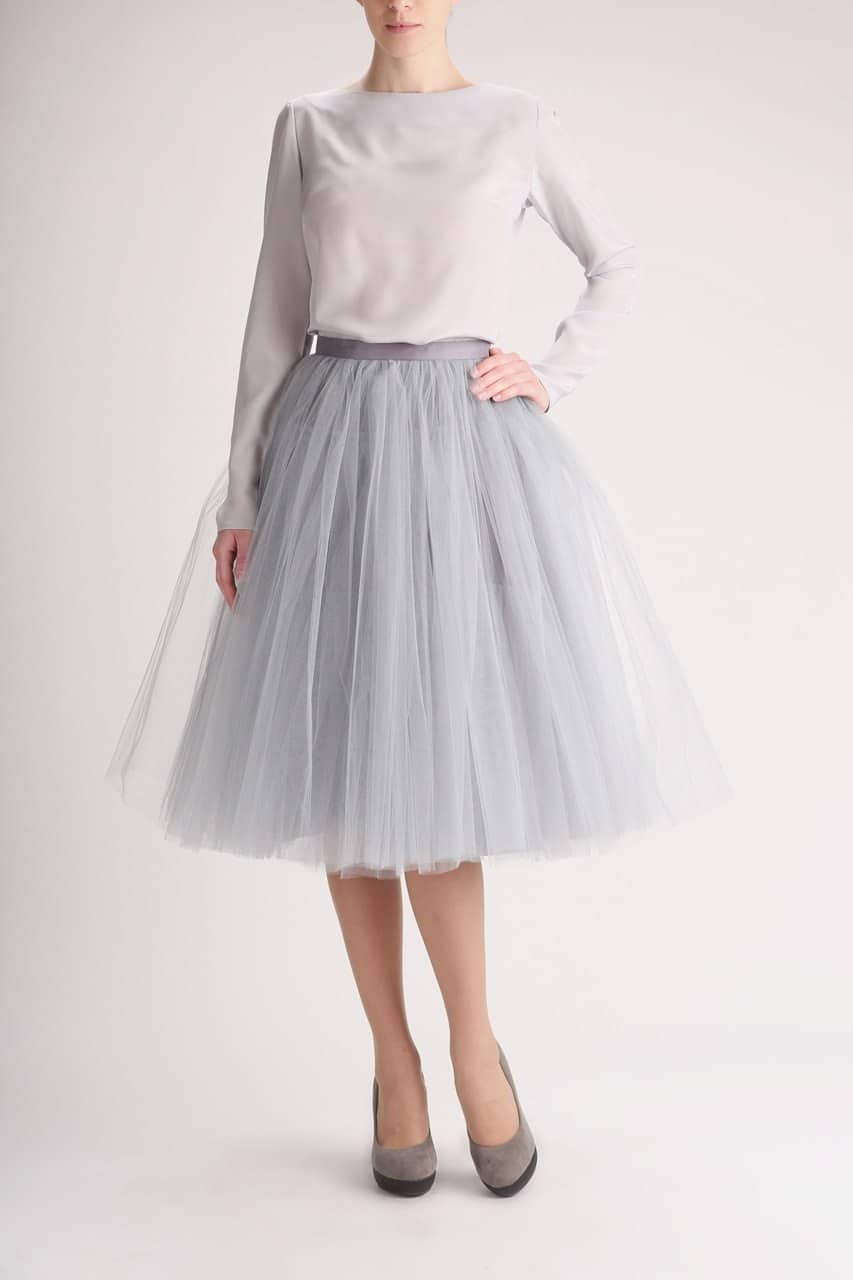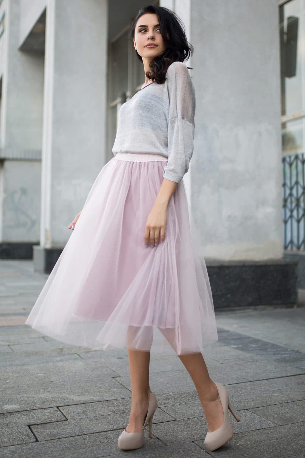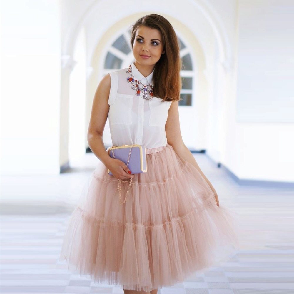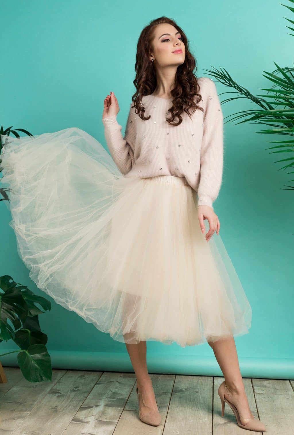 Fluffy light skirts midi below the knees, they will look good with a light, plain sweater or gentle tones with a light blouse. The main thing is not to weight the image with bulky accessories, while maintaining the lightness of color.