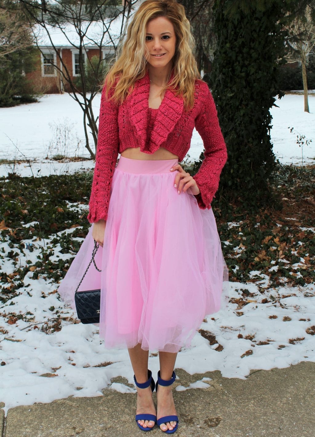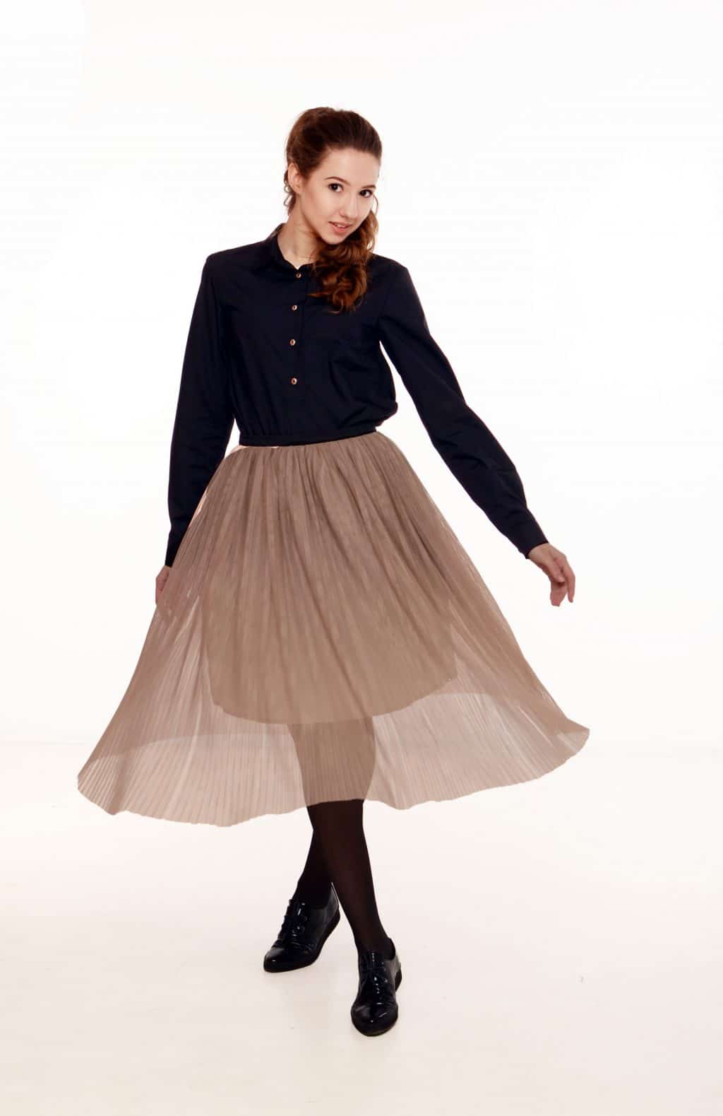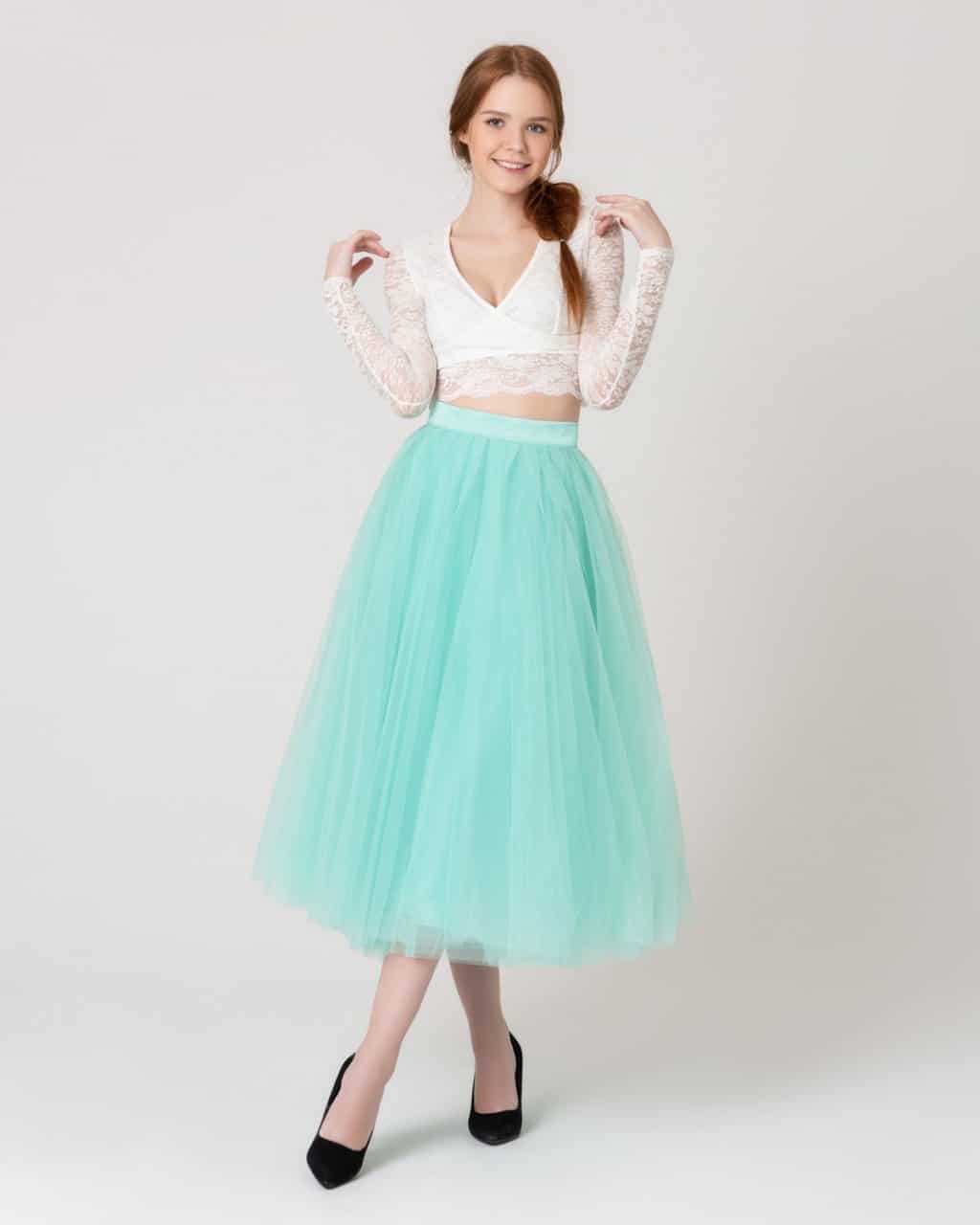 Fluffy light skirts midi below the knees, they will look good with a light, plain sweater or gentle tones with a light blouse. The main thing is not to weight the image with bulky accessories, while maintaining the lightness of color.