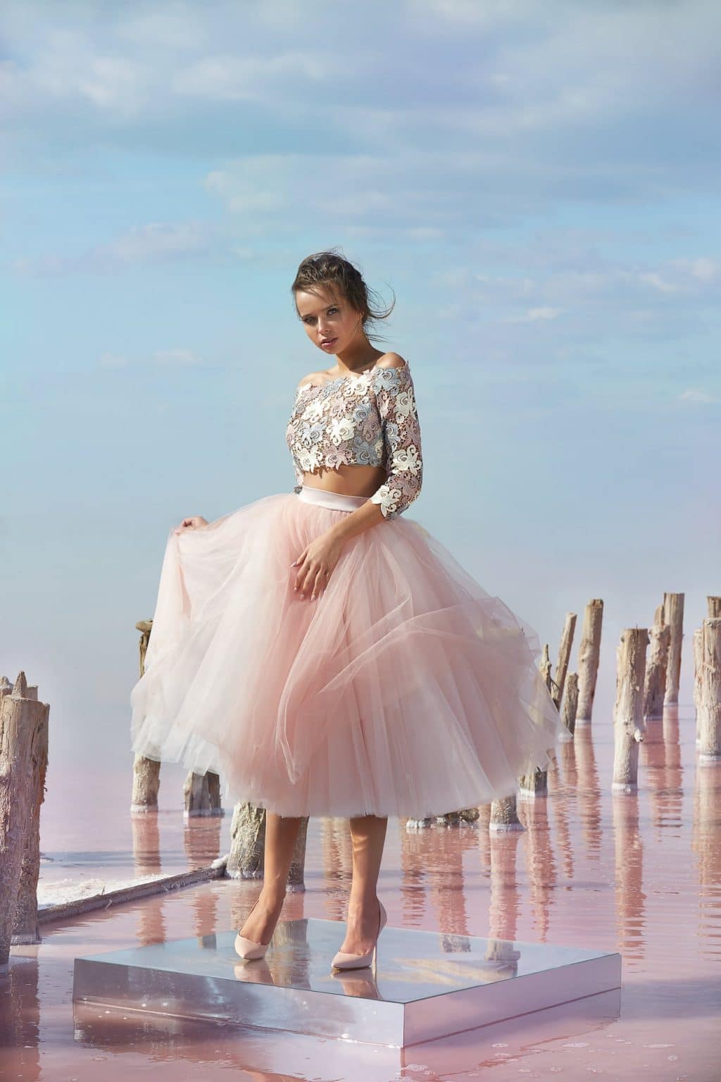 For a girl who chooses a full skirt to the knees it will be in harmony with a short top.