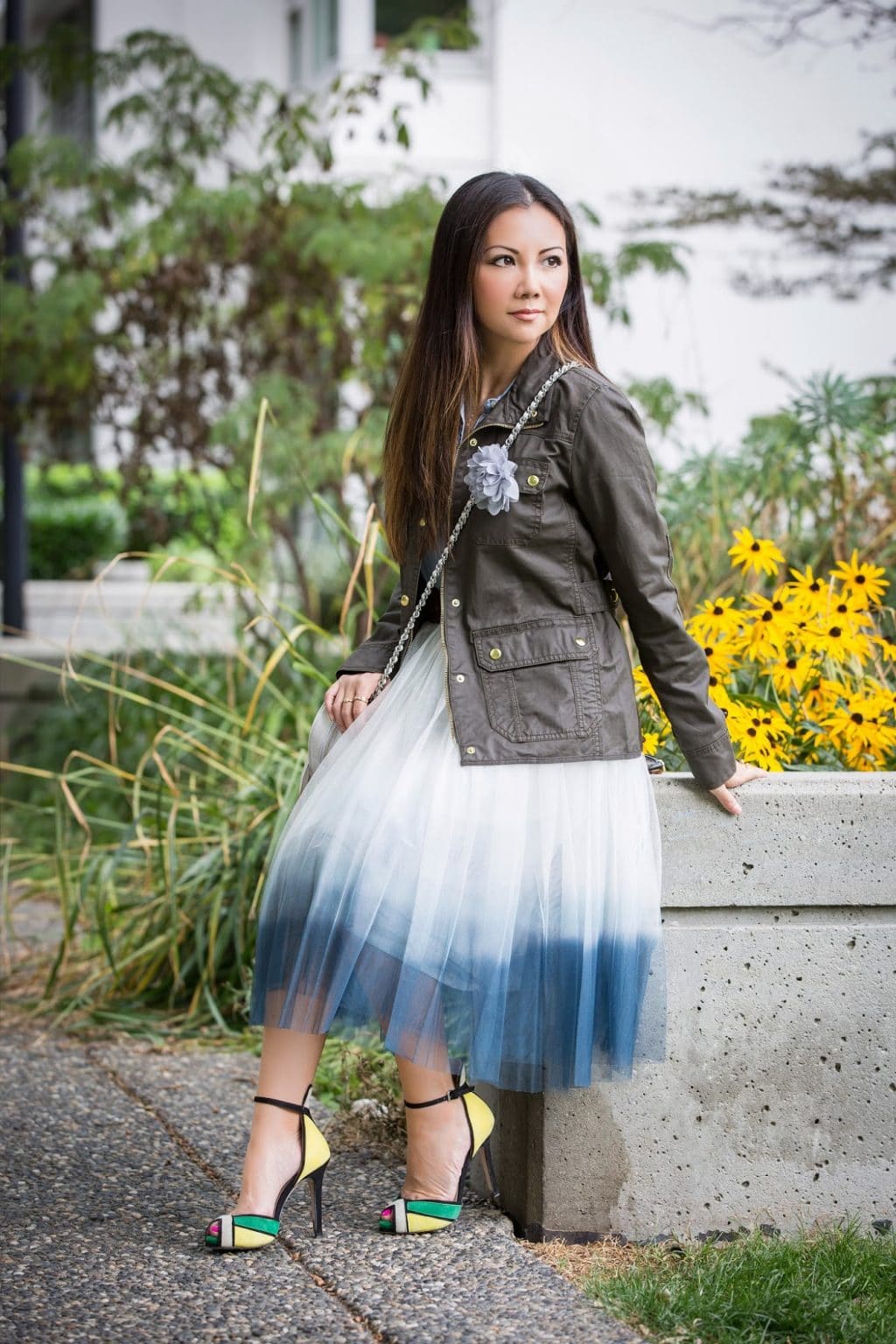 A long fluffy skirt can be easily combined with a bright blouse and a beige jacket. And, replacing the blouse with a shirt and adding accessories, you can dilute this image.