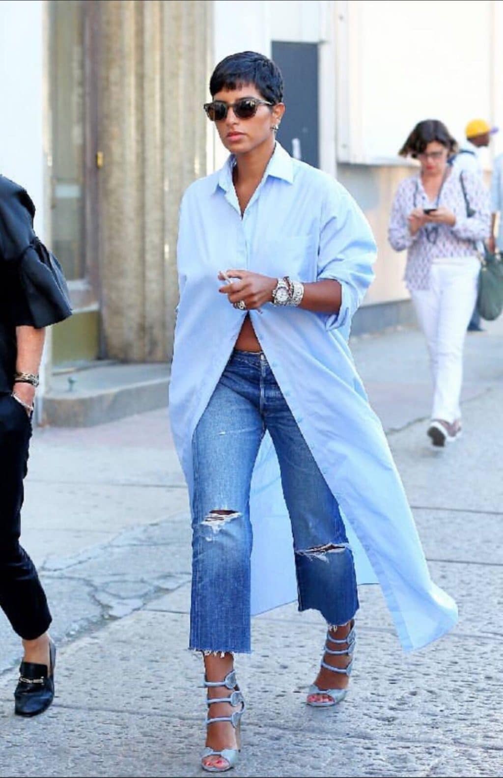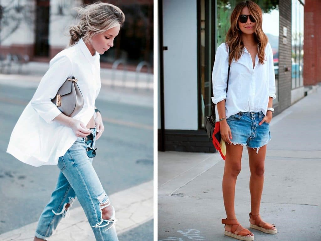 Light, airy shirts in a delicate palette will be a great choice. If there is a belt in such models, this will be an additional advantage. One of the most successful combinations is a white, long shirt and blue jeans.