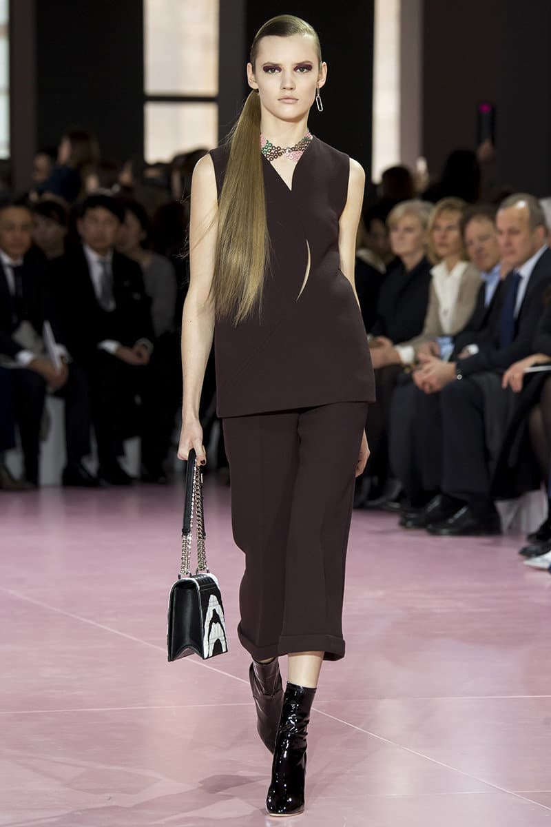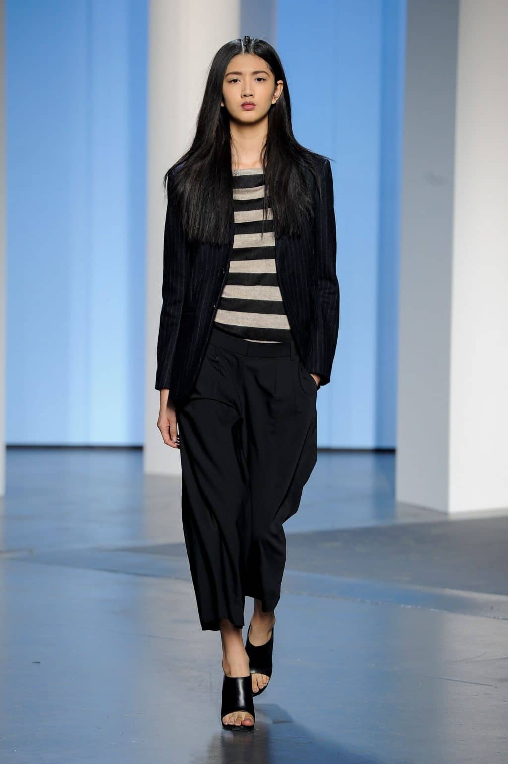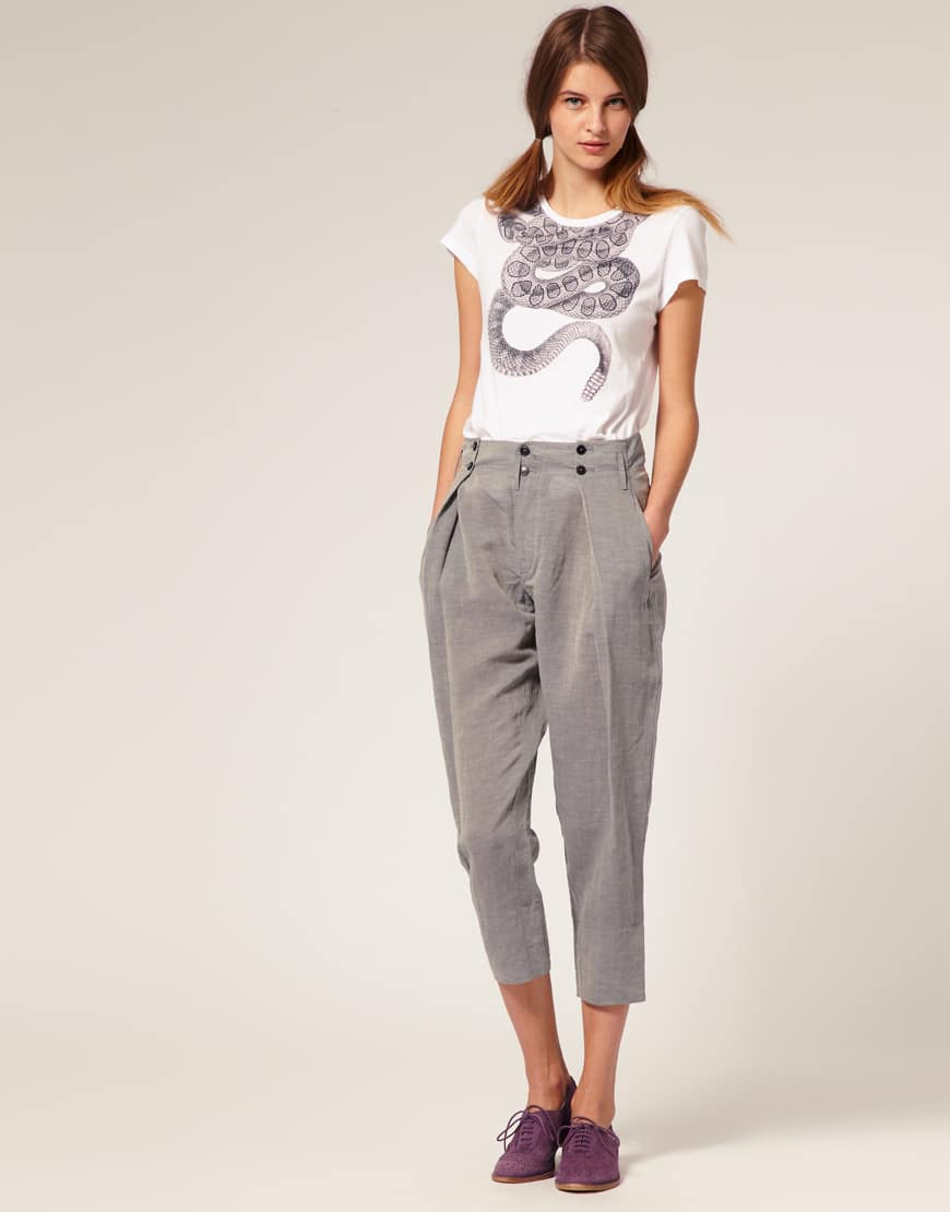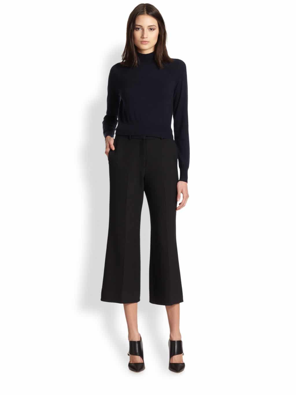Cropped trousers and a dark top.