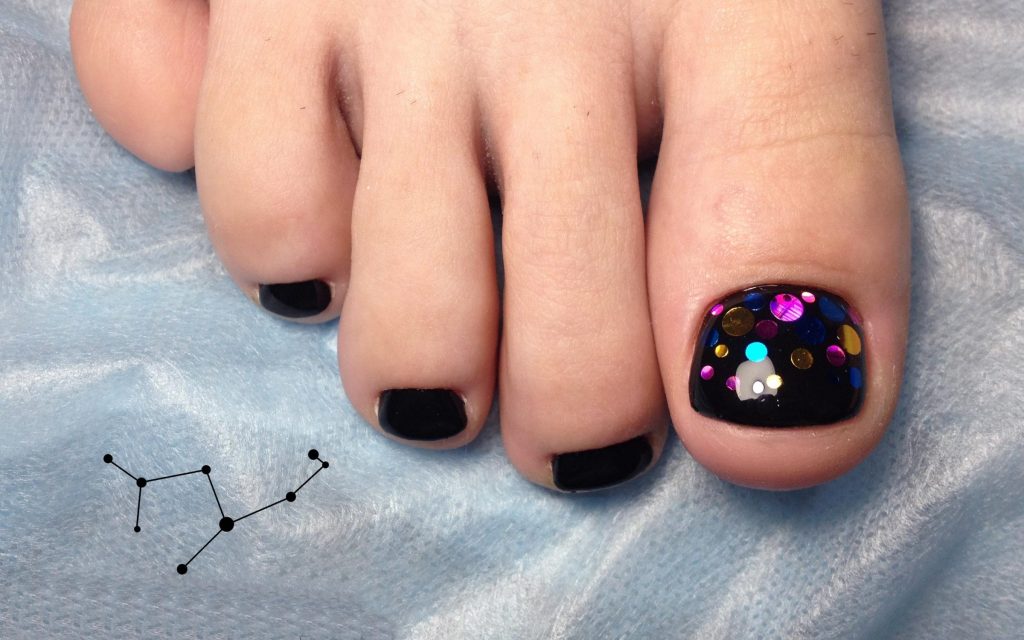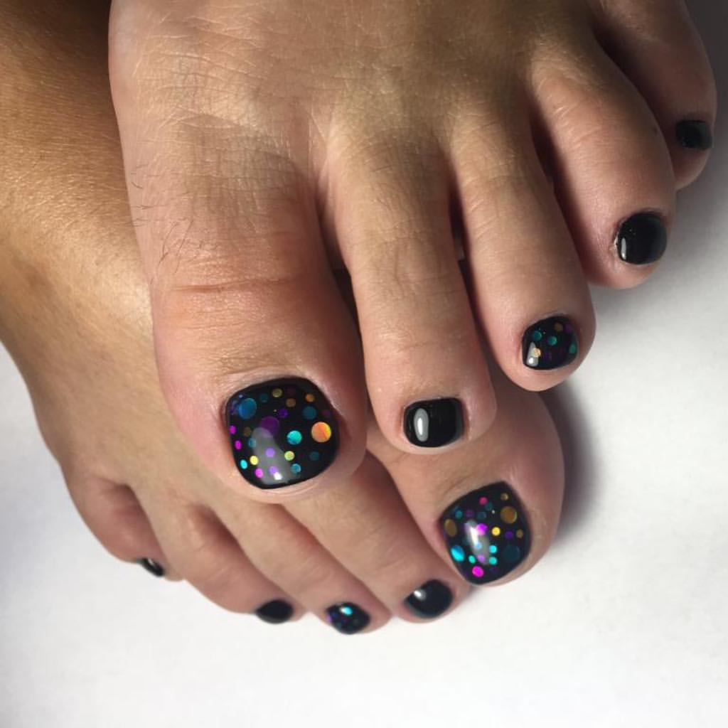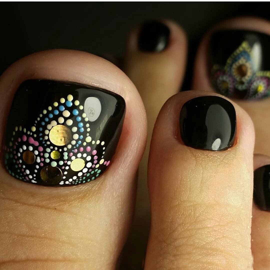 Any design will look gorgeous on a black pedicure. Black will emphasize all design elements even more. It can be various patterns, dots, stickers, cubes, cage.