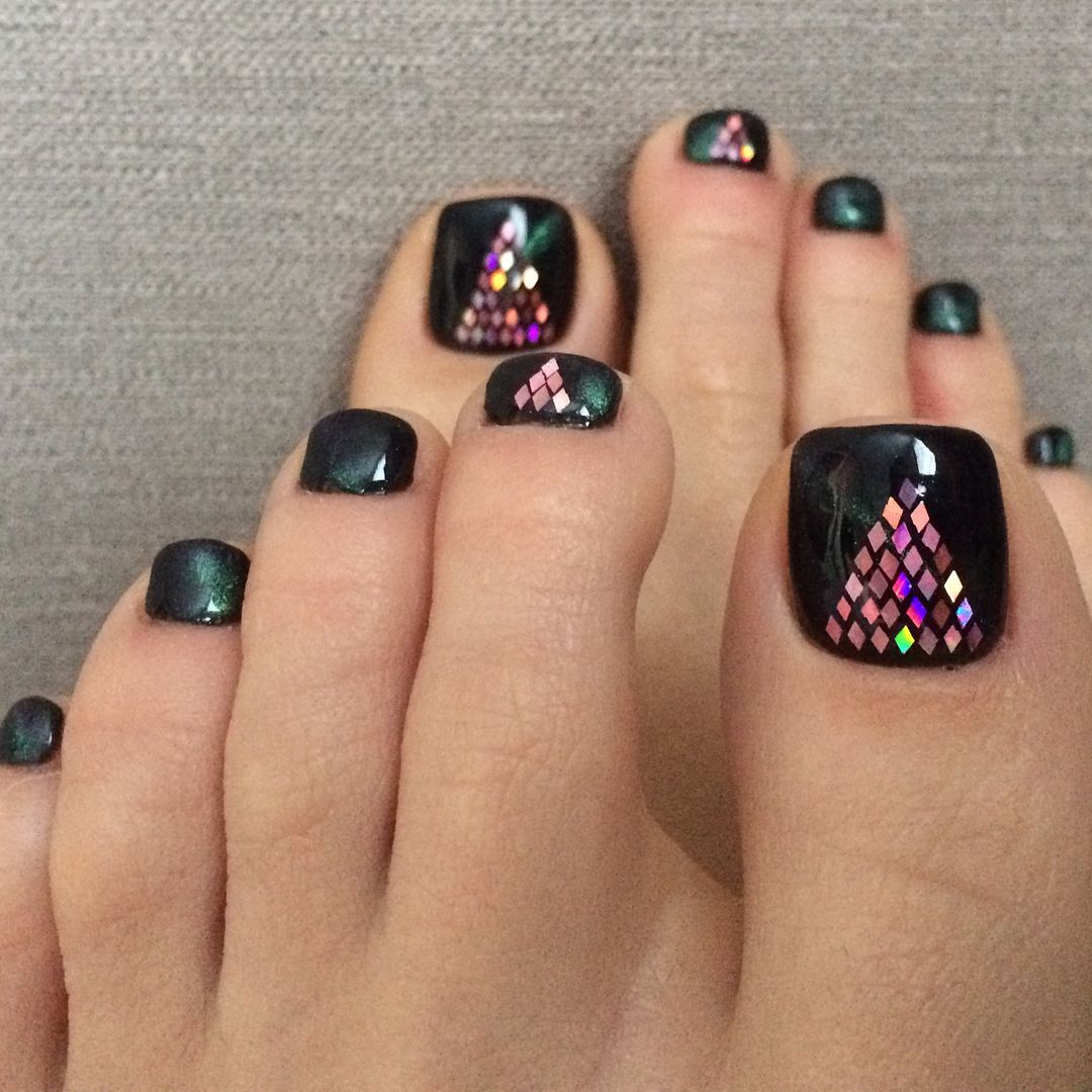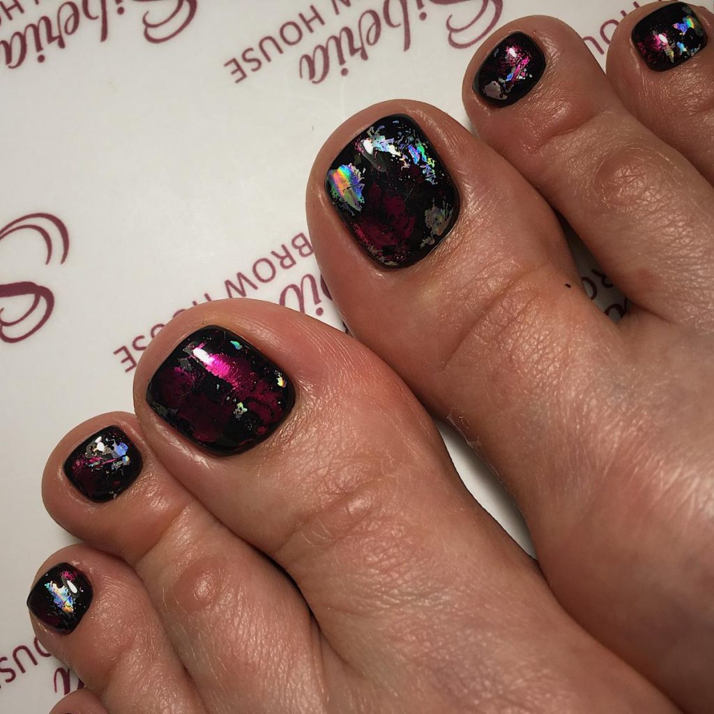 A beautiful and simple design on a black pedicure can be done with foil. In this case, the foil can be any shade.