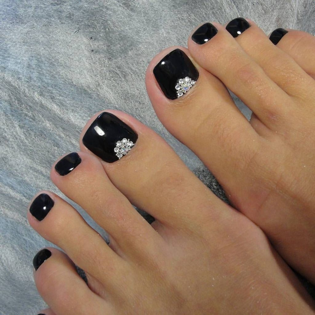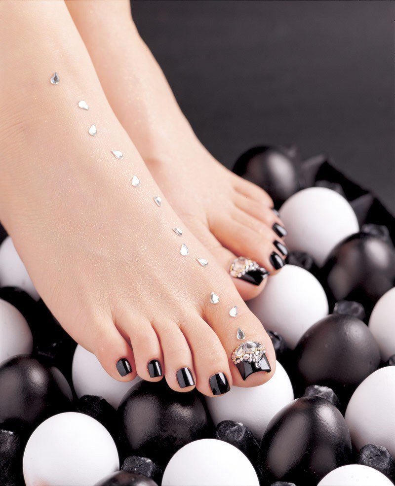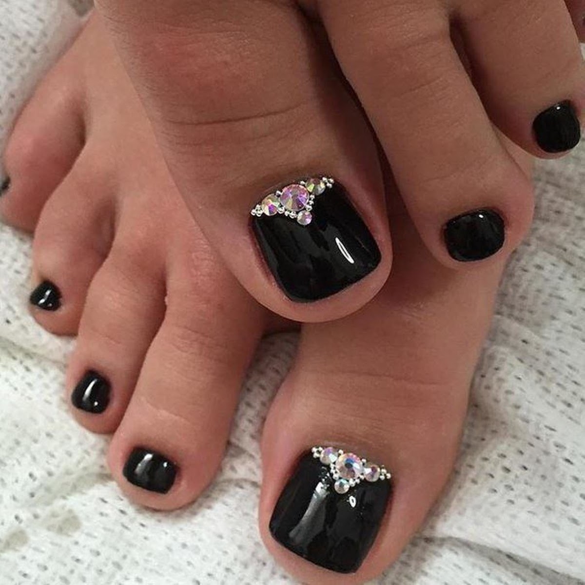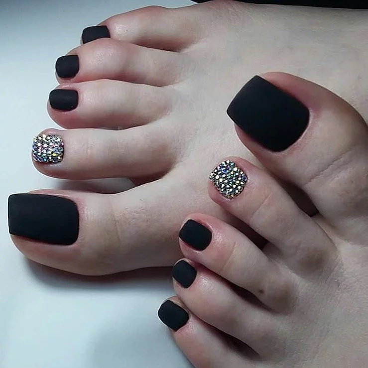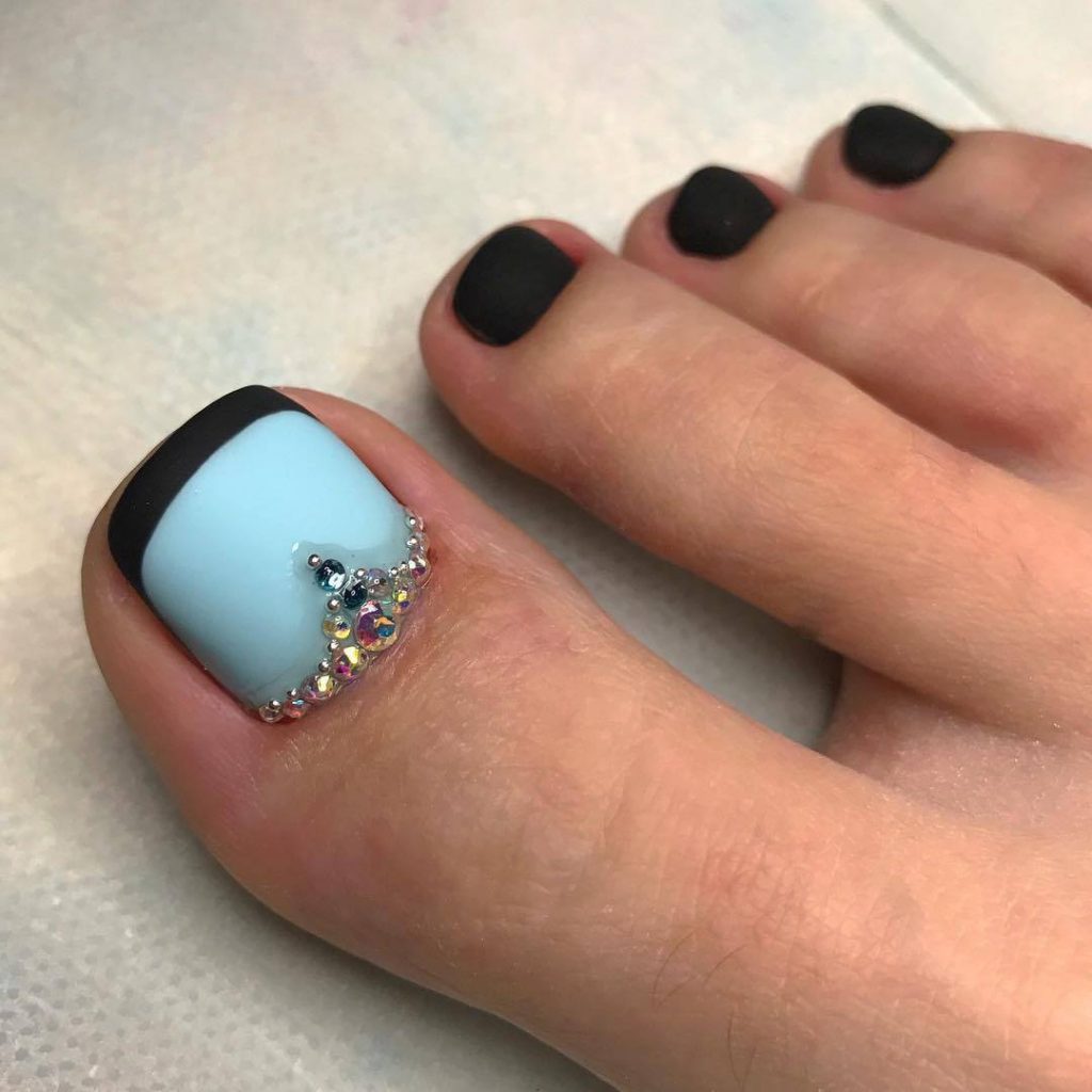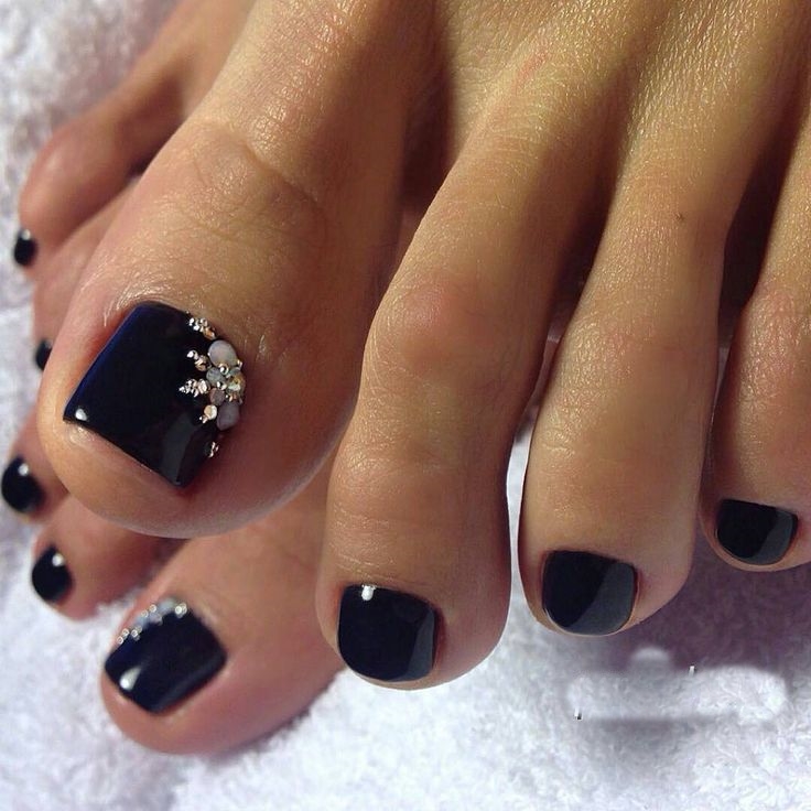 Black pedicure with rhinestones will shimmer in all shades. From a rhinestone, you can lay out a hole or a triangle at the base of the nail, or depict some stripes.
