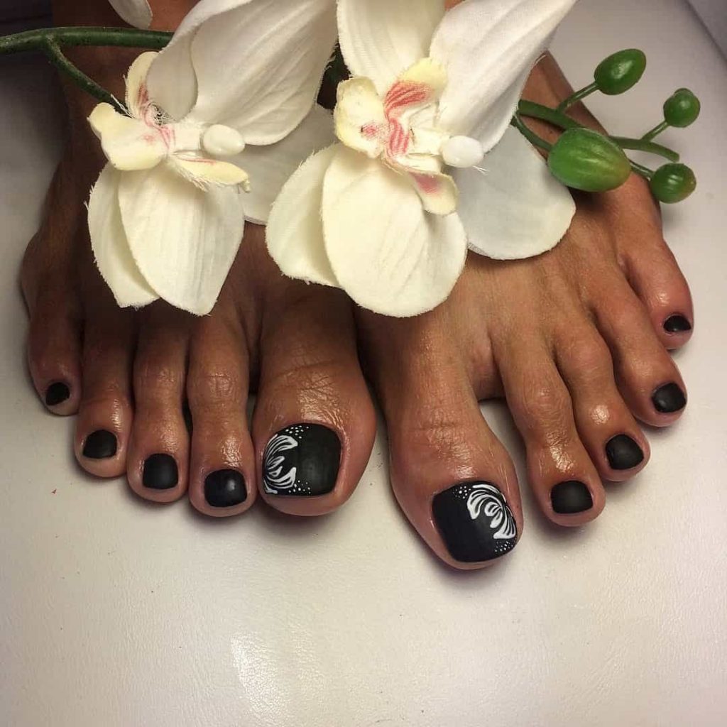 If you want to do a black pedicure, then it is not necessary to dwell on a monophonic option. There are so many options for black pedicure. And now we will consider some of them.