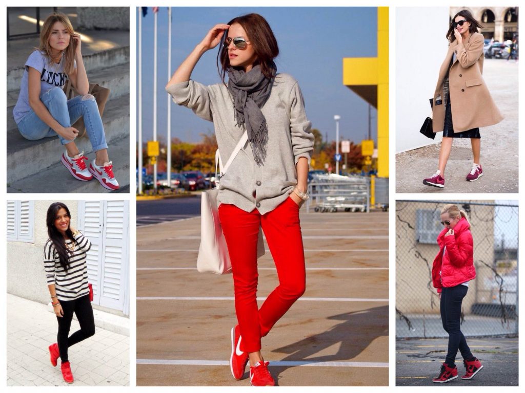 A fairly popular option is red sneakers. They are bright, attractive. With their help, you can create different images, spending a minimum of time.