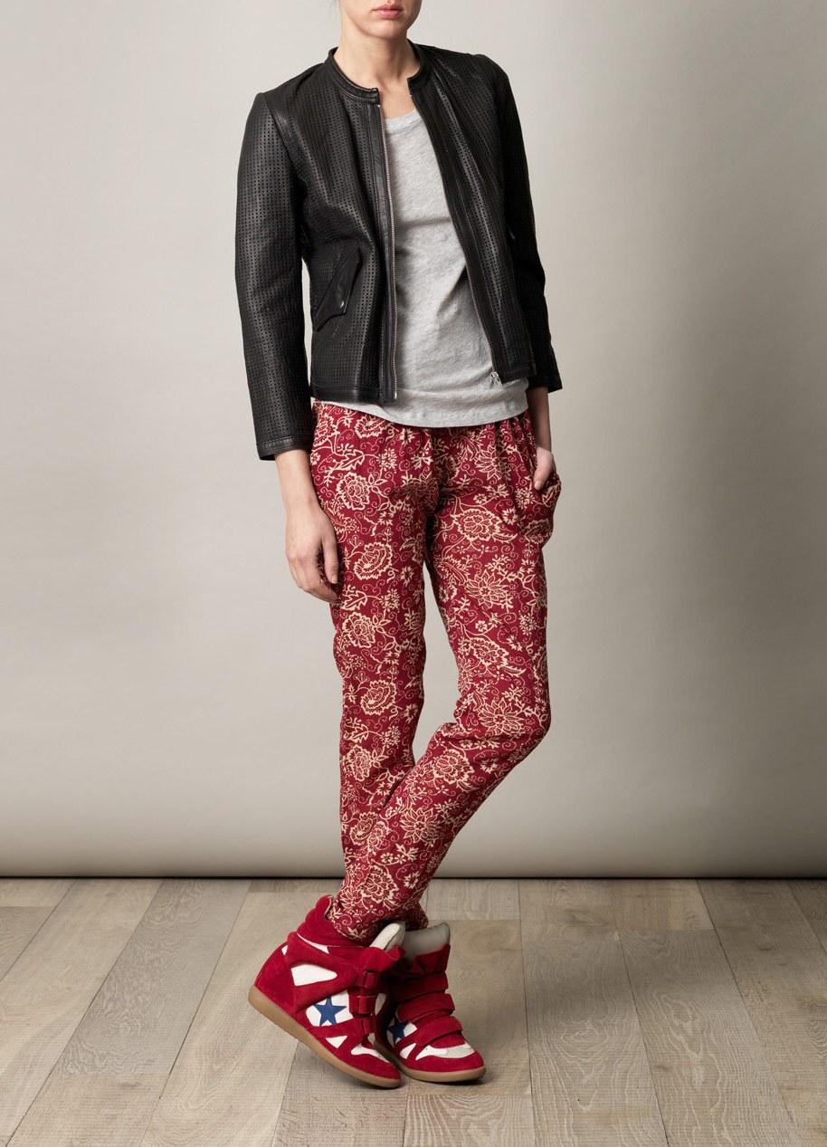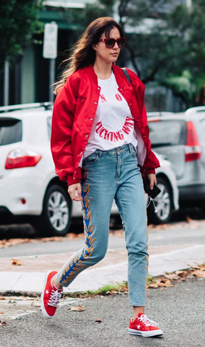 Create a monochrome look with red trousers and red sneakers. It is better to choose your top for such trousers light or black so that you do not merge with colors.