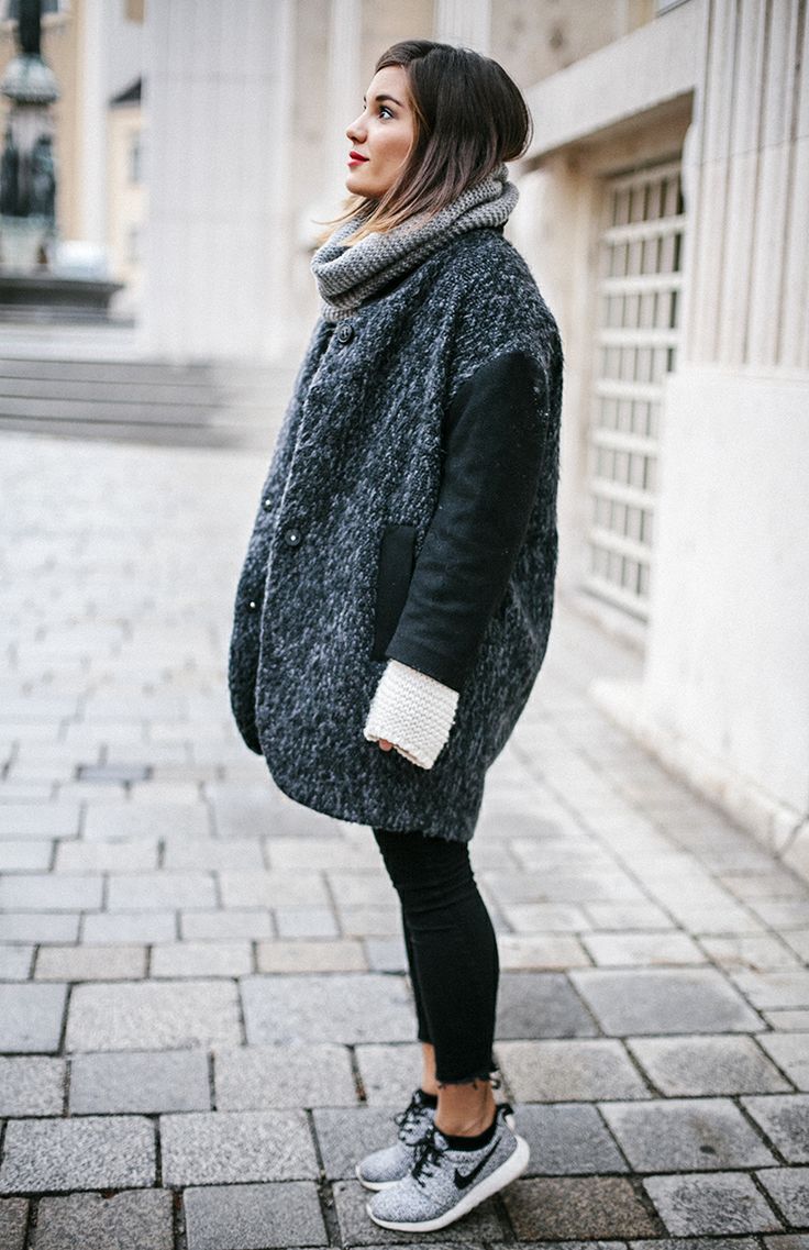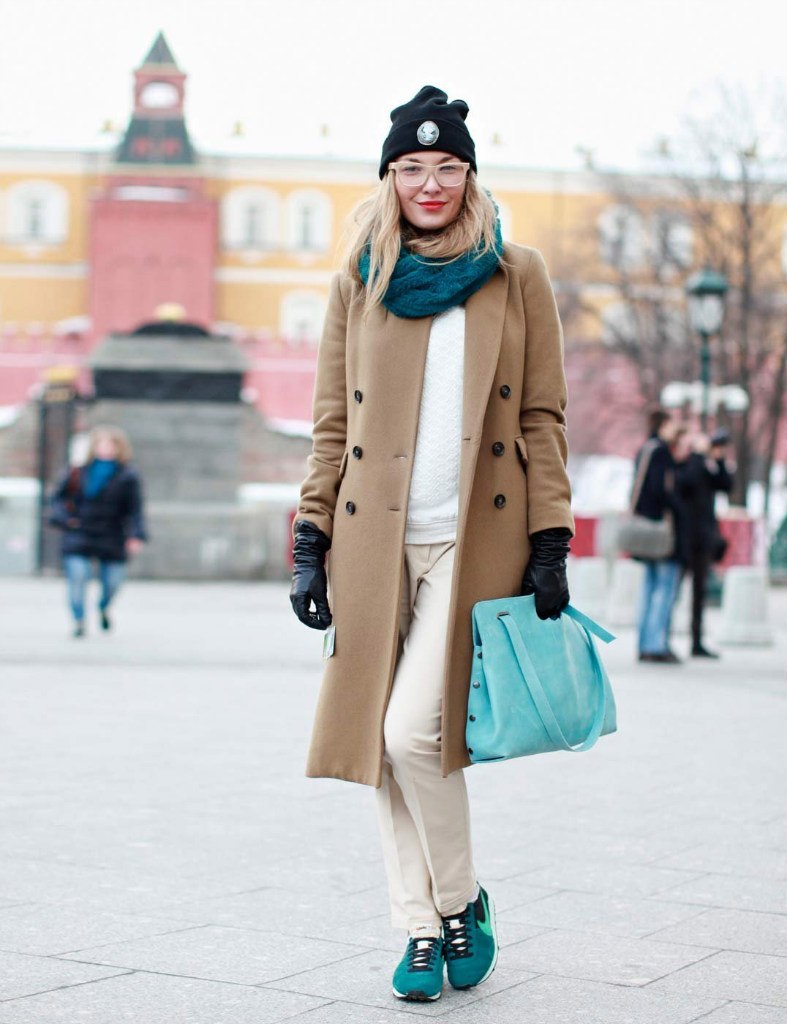 In other variations, you can wear pants in black or a more interesting color, such as camouflage. Red sneakers can then be on the platform or regular. As a top, if you pick up a bright print top, the cloak can be chosen in black.