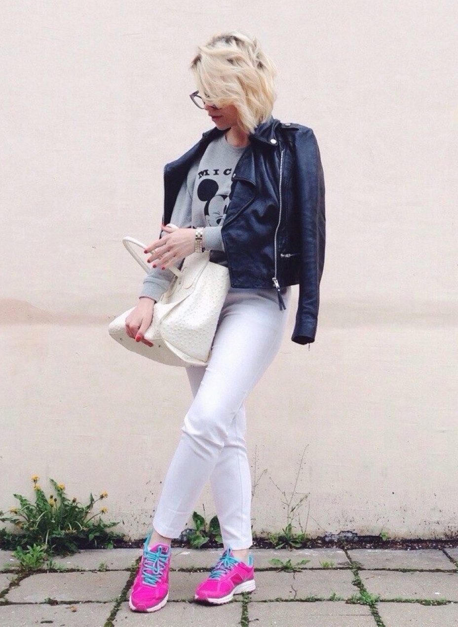 In other versions, pick up classic things with pink sneakers. That is, classic jeans, not flared, black or white trousers, not culottes, etc.