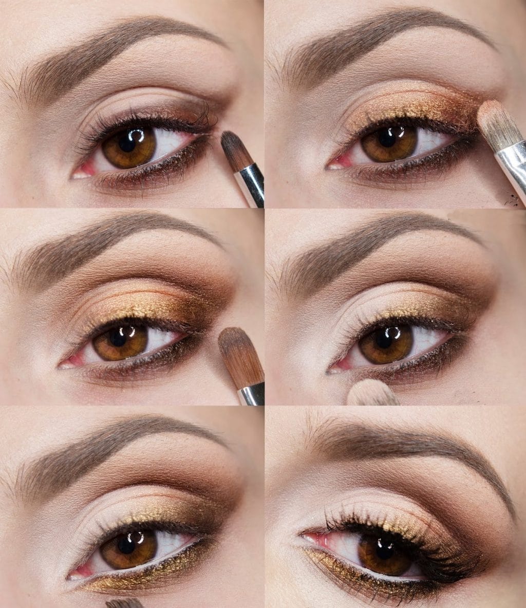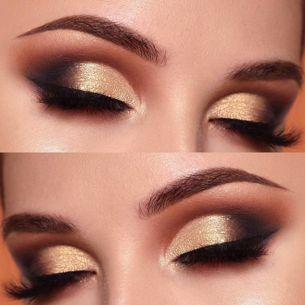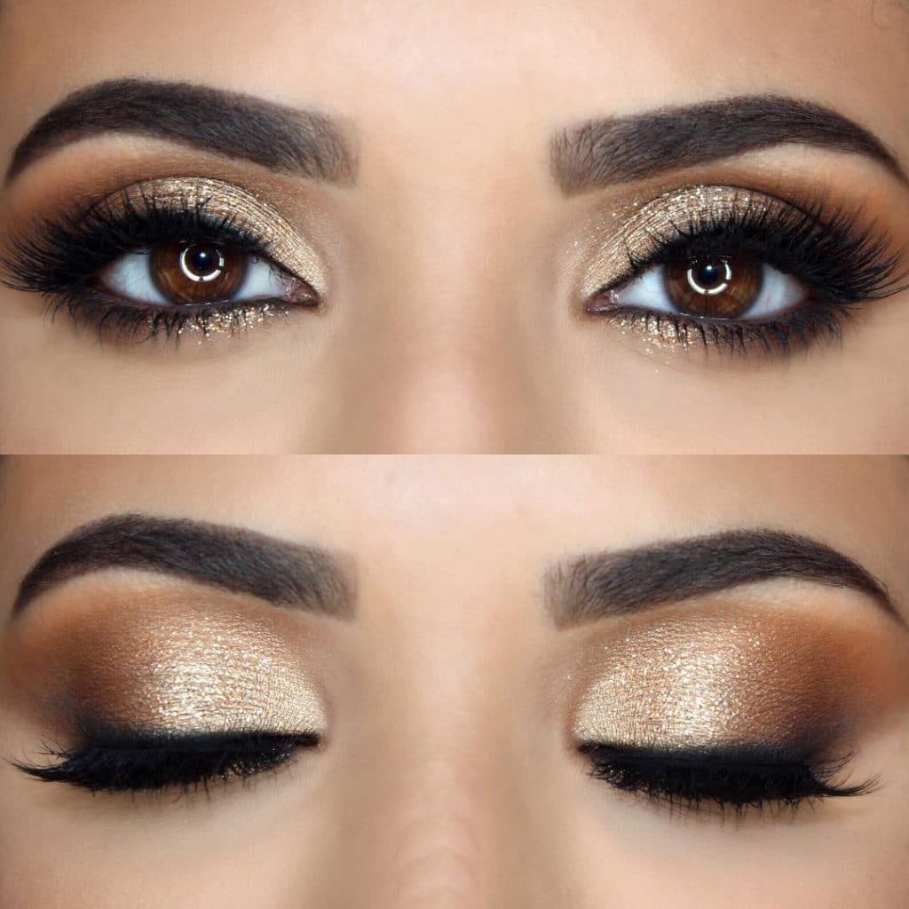 One of the most successful and spectacular types of makeup for brown eyes will be the option with golden shades. It can be just shadows with a slight golden tint or a golden pigment that you can apply on top of any shadows, and your makeup will take on a completely different look.