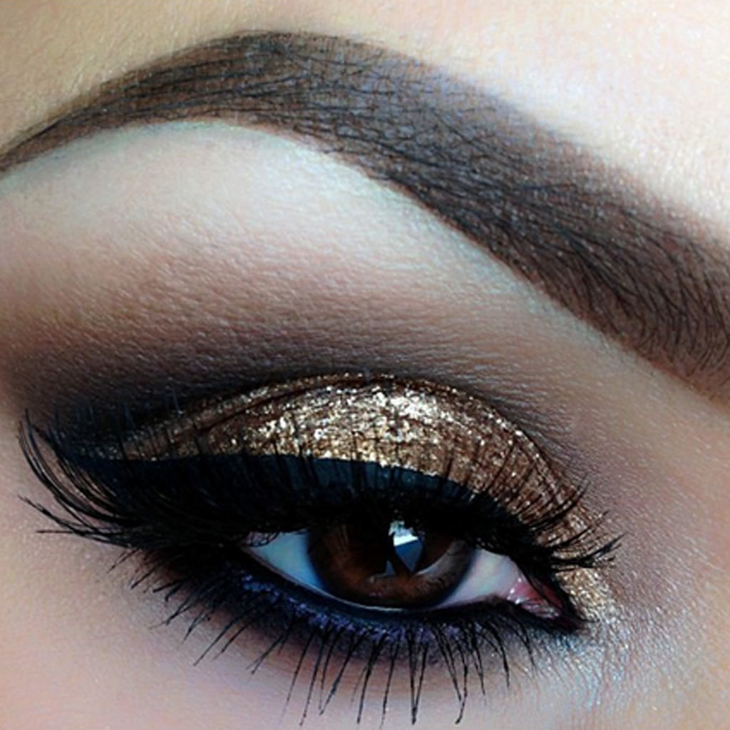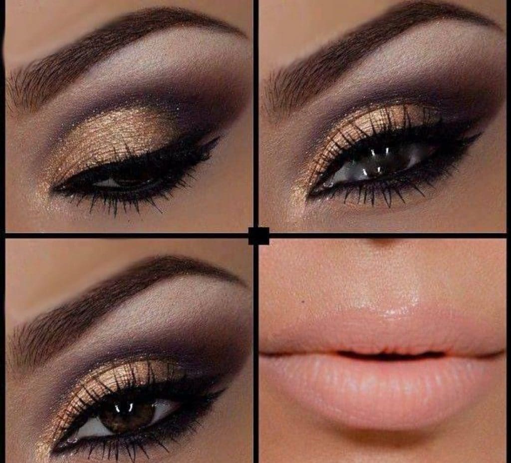Flicker is back in fashion. And for brown eyes, this is a great option. Maybe this makeup is not for every day, but with it your eyes will shine. And for everyday makeup, you can use the main shimery color, and the corner is darkened with matte or vice versa.