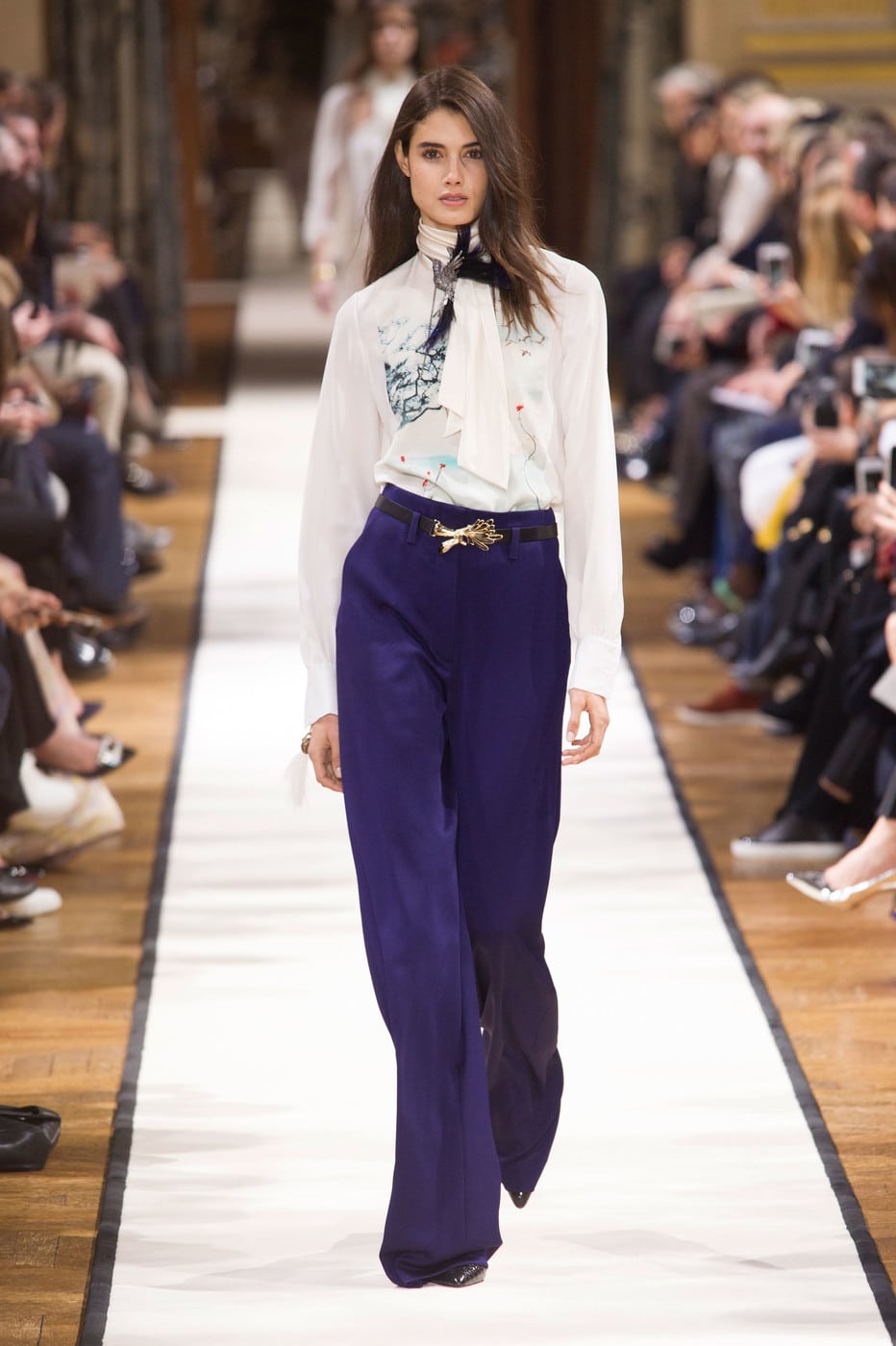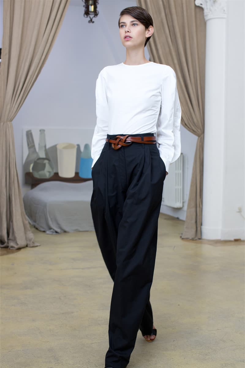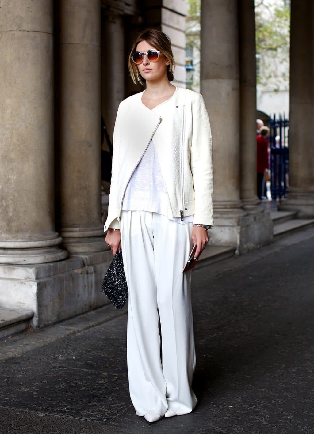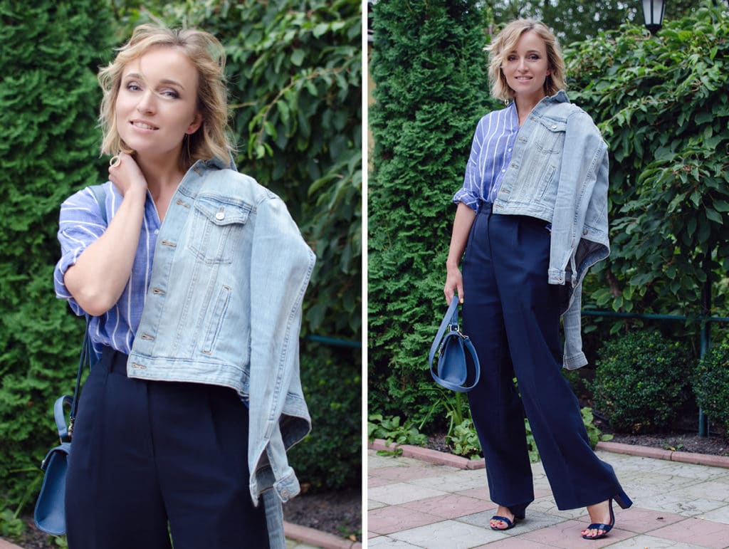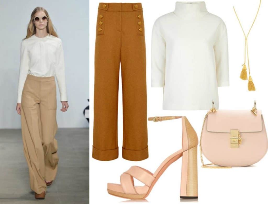 If you are going to work and decide to wear wide trousers, then calmly pick up a silk, white or light blouse for them. Add a thin black or red belt to the outfit, and choose shoes to match your belt. Your blouse can have a different neckline, from deep to closed with a standing, English collar.