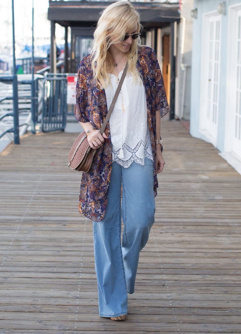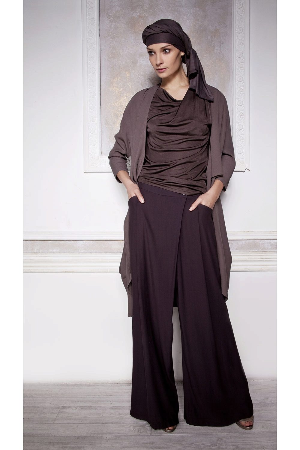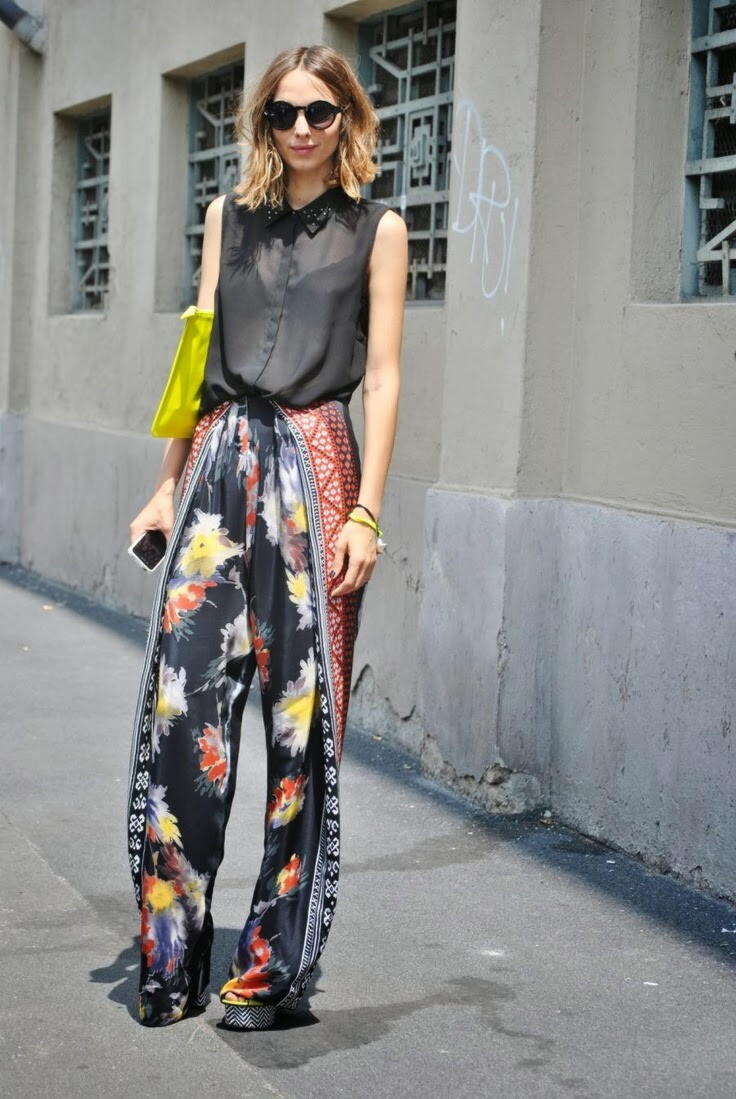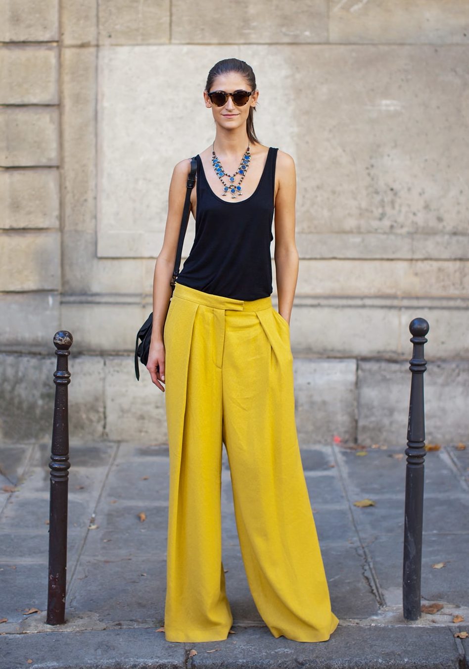For lovers of dark, saturated tones, under bright or printed wide pants it is best to choose a plain top. Because, choosing too bright, screaming tops, you risk creating a very lurid image.