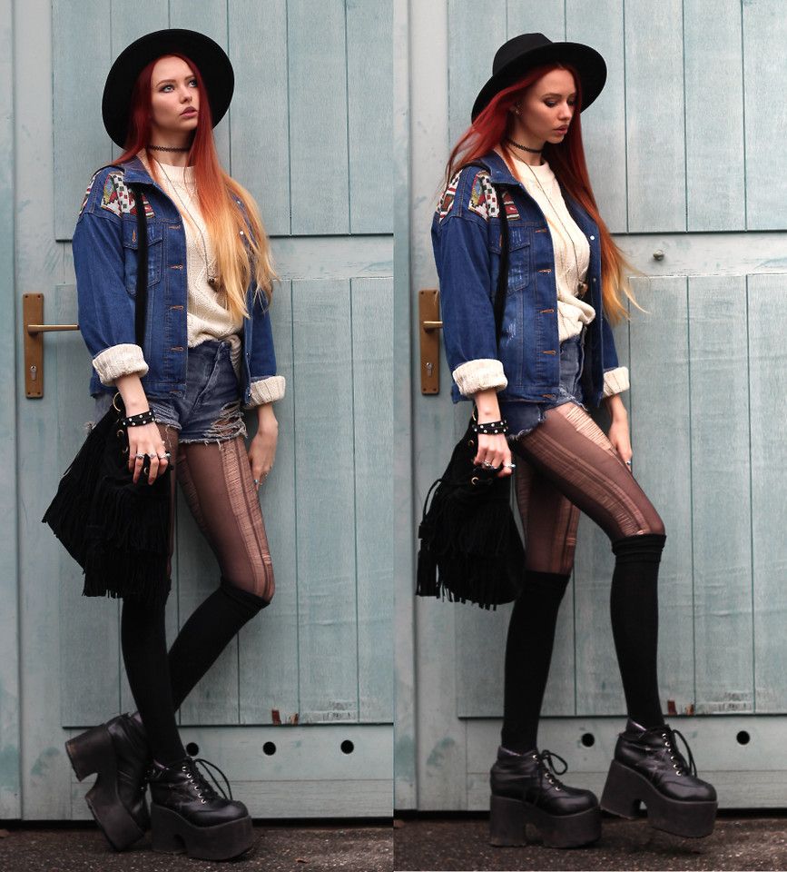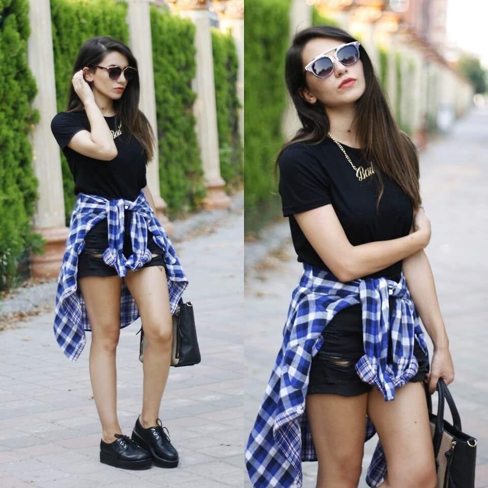 The most common type of socks of such shorts is a denim shirt in color. The shirt can be worn in the usual way, or you can tie it with a knot on the tummy. You can also choose sandals in the form of summer boots for jeans shorts, a T-shirt in dark color, and tie a plaid shirt around the waist.