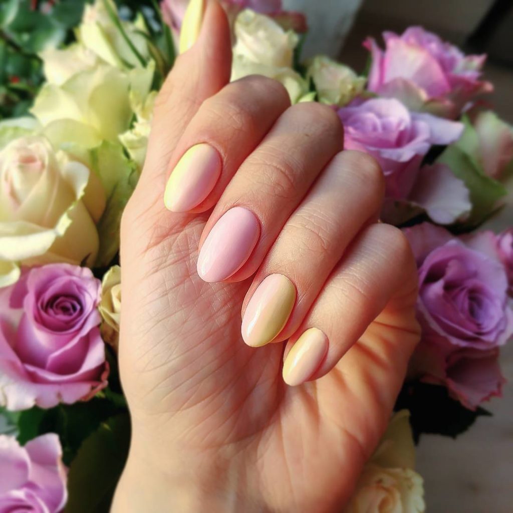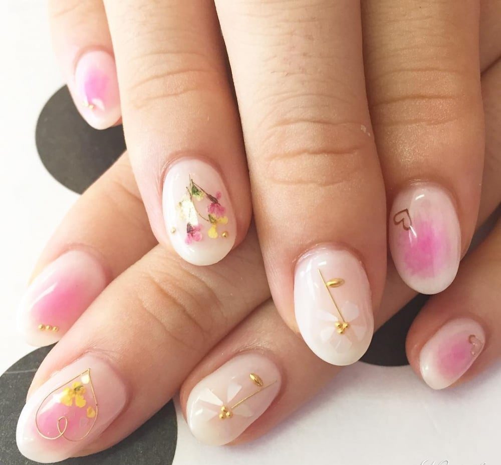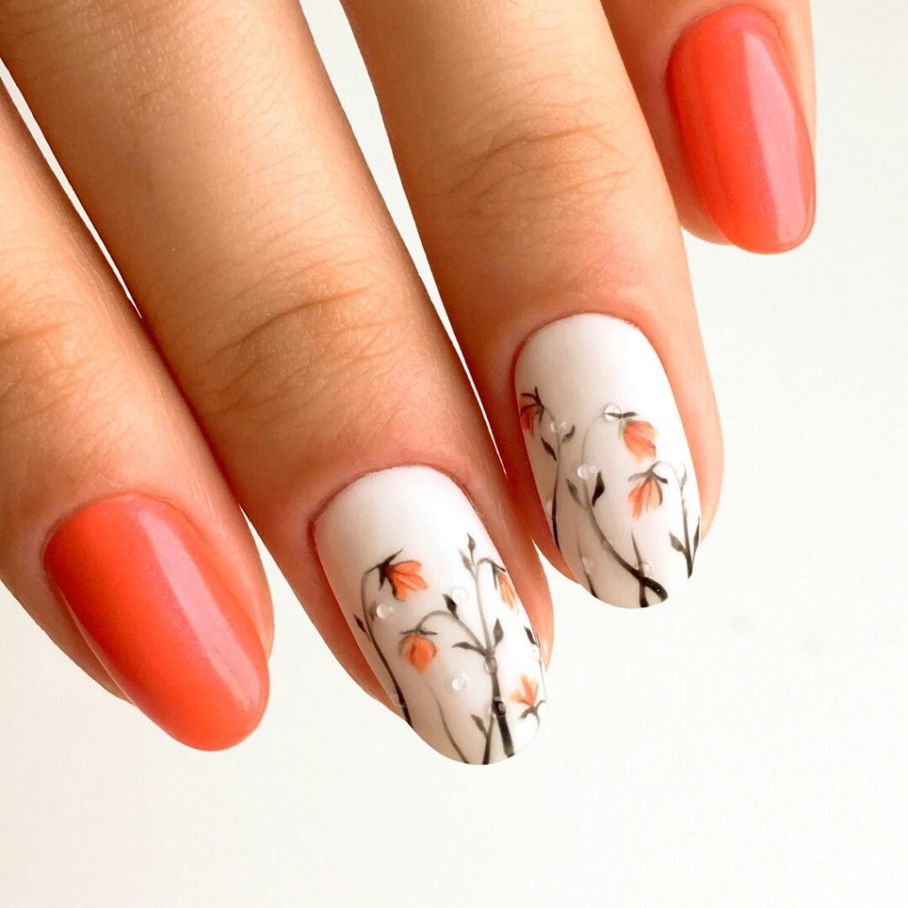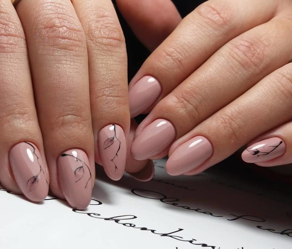 This design combines calmer tones and floral patterns. This makes such a manicure gentle and sophisticated.