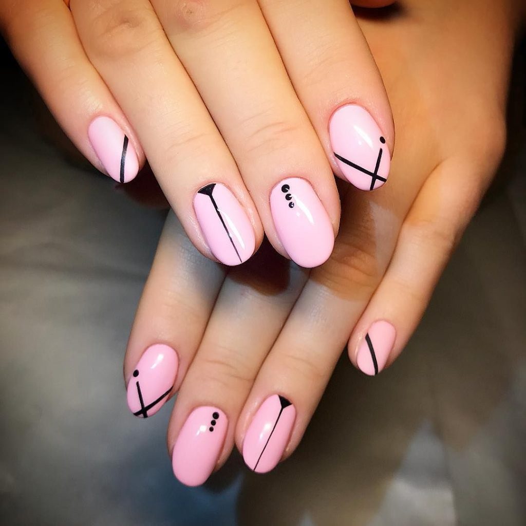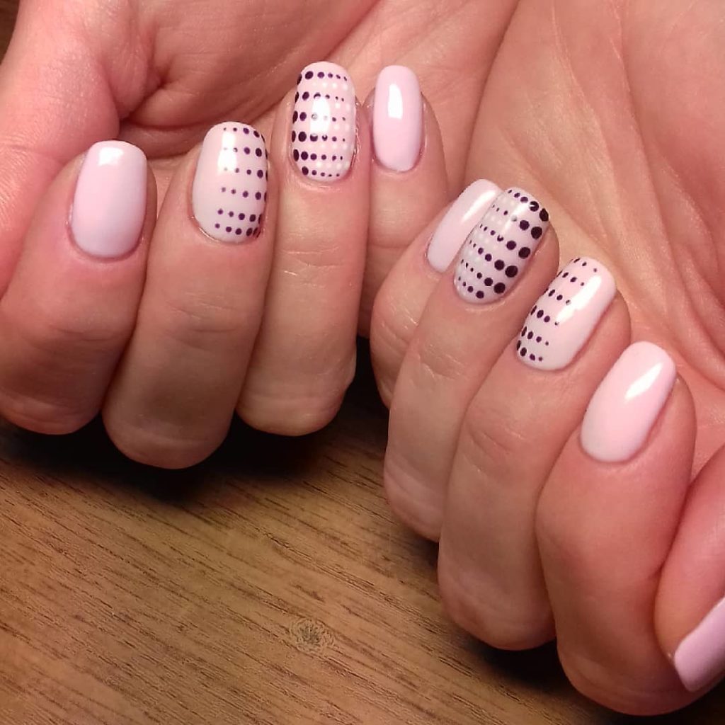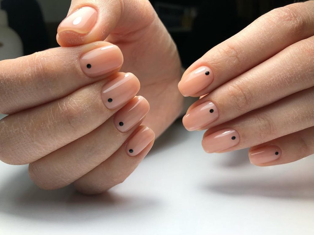The minimalist design effectively smoothed complemented by dots. Winning but such a manicure will look on a light, calm, not bright coating. Place a point in any part of the nail at the beginning or around the perimeter in several places. Such a manicure can be done in brighter colors.