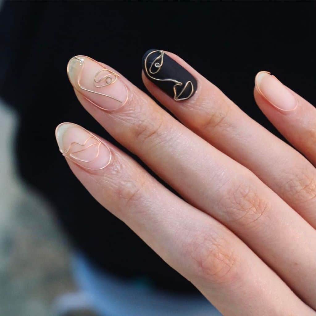 This design is performed on a light black and flesh background. Having made patterns from the wire, they are applied to the nails. Highlighting the nails in a separate color and make a pattern on each finger on it. It looks interesting and not usual.