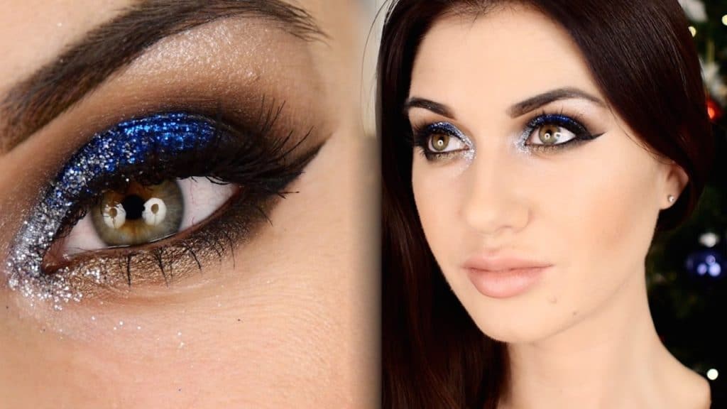 Holiday makeup differs from usually in that instead of the standard classic colors of shadows or pencil, you should choose bright, gold, silver or other bright colors. To create a frosty effect, use blue with sparkles. Do not forget to highlight the lower and upper eyelids with a pencil.
