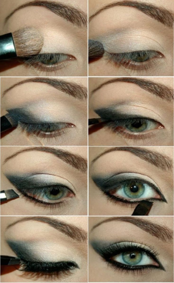 First you need to apply a primer forever. It will provide resistance to your makeup for the whole day. If you decide to make your makeup black shadows, then take a black pencil. Then draw two lines with a pencil, one on the upper eyelid, the other on the lower and connect them in the outer corner of the eye. Then blend it.