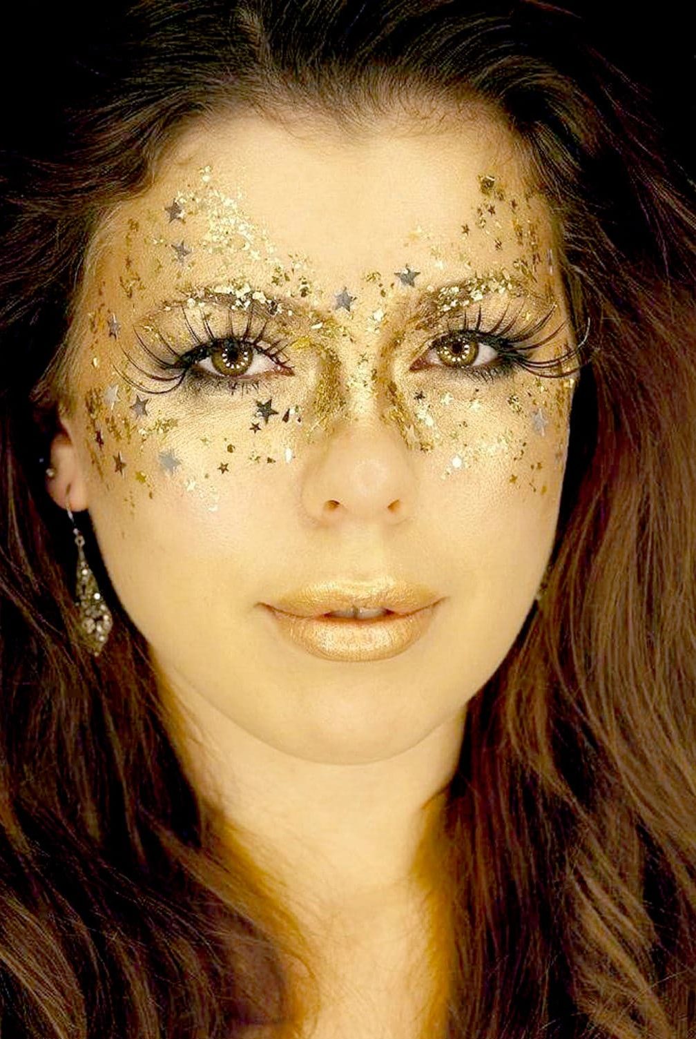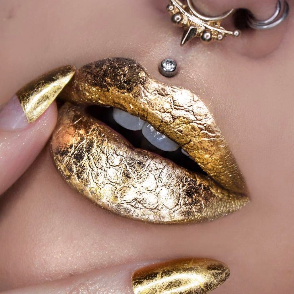 Very often, gold color is used for stage makeup or for masquerades. Here you can no longer be limited to golden lips, applying glitter to the moisturizing lipstick. Or you can "gild" the whole face. Such makeup will make your look very spectacular and memorable.