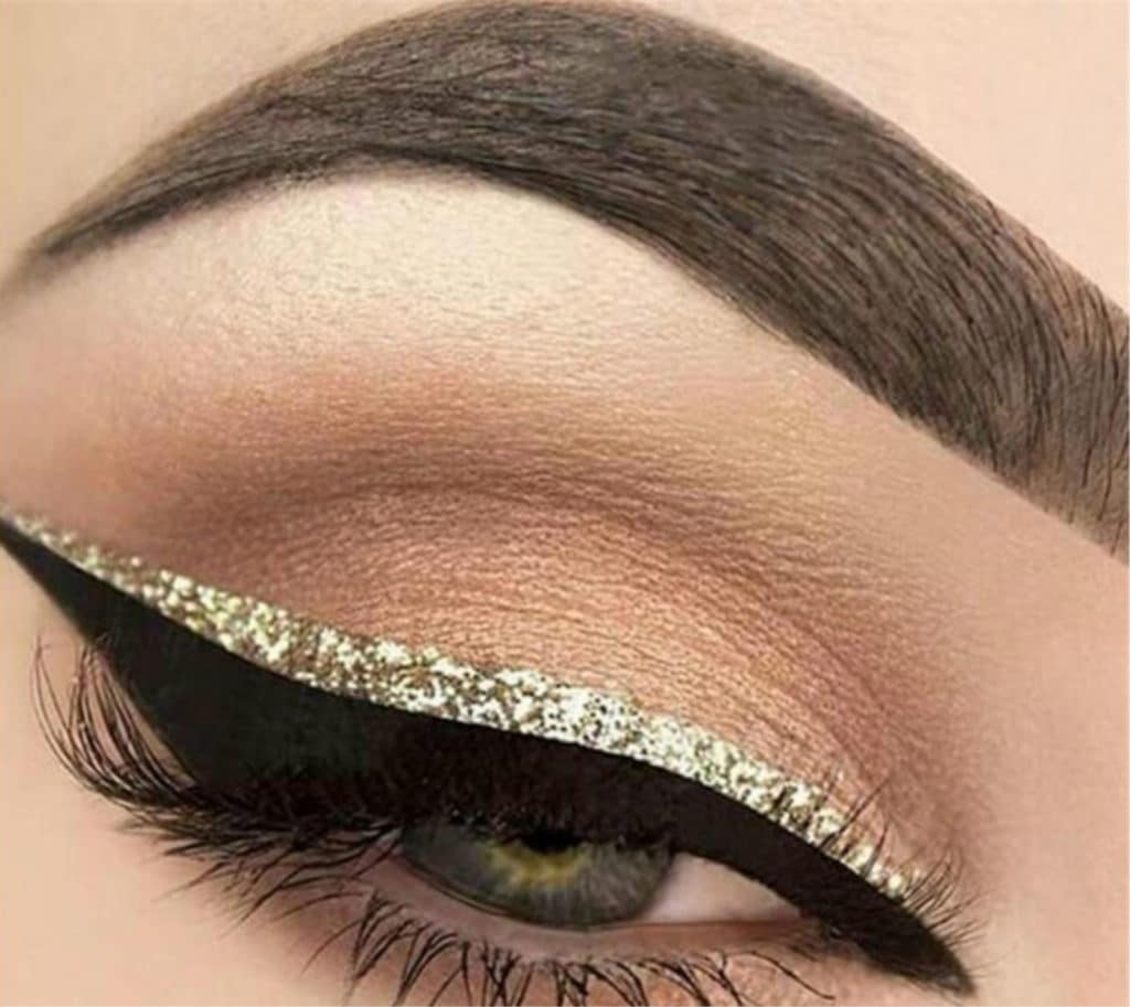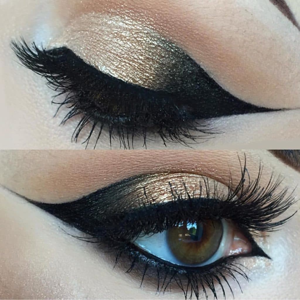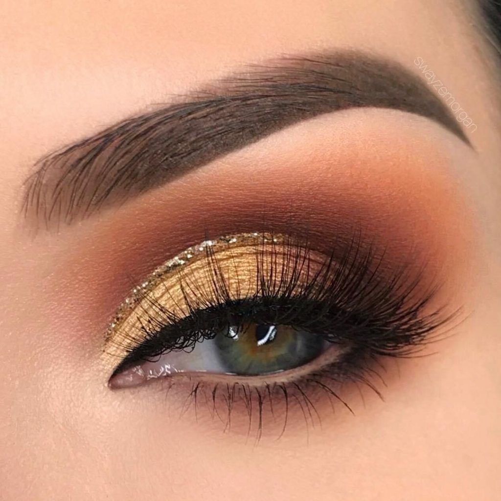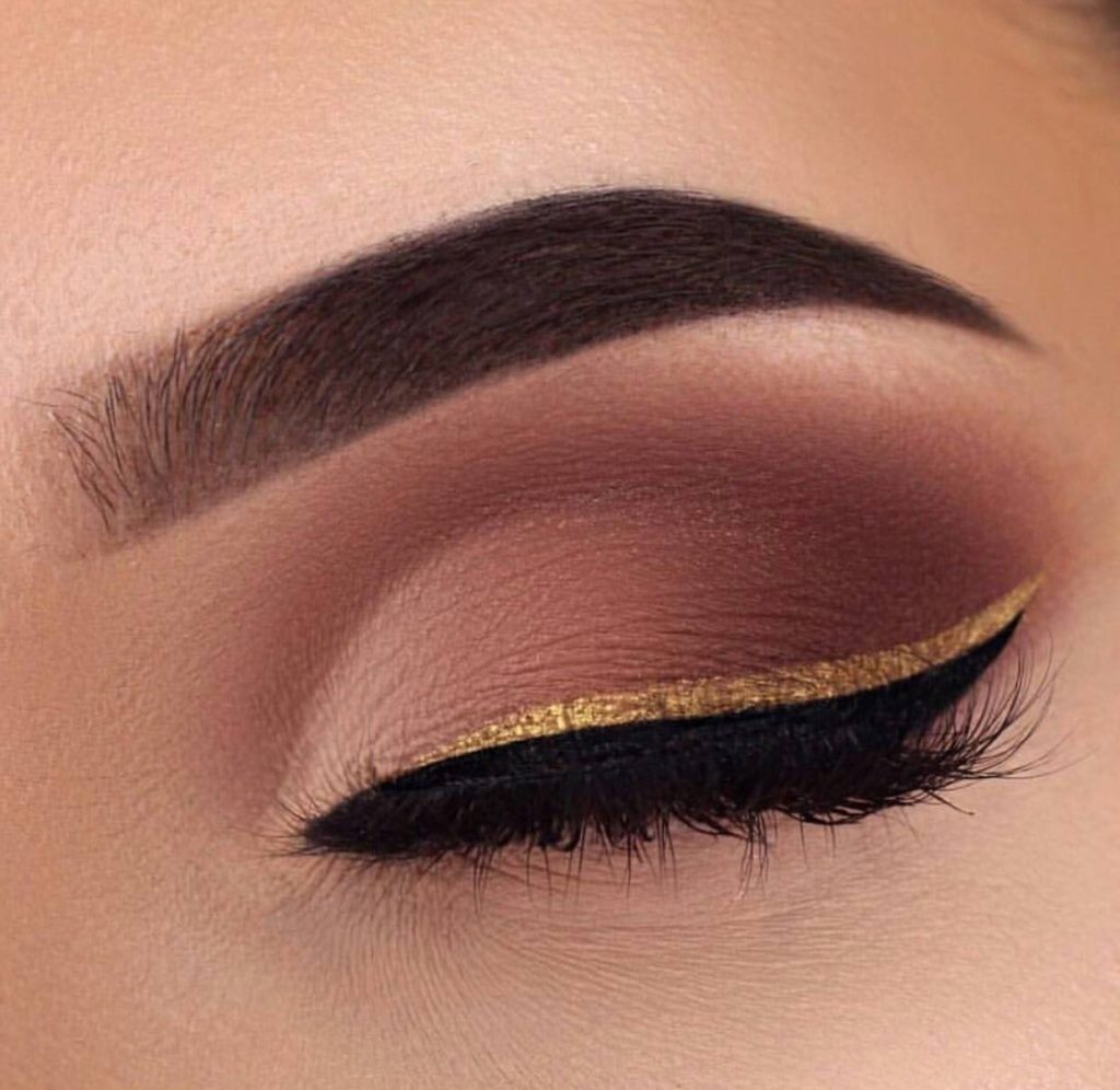 Just imagine how to transform “cat's eye” makeup if it is done in gold. So make-up is done with the main gold color, and for the corner use bronze, brown, gray, black. The corner can be made shimer shades or matte.