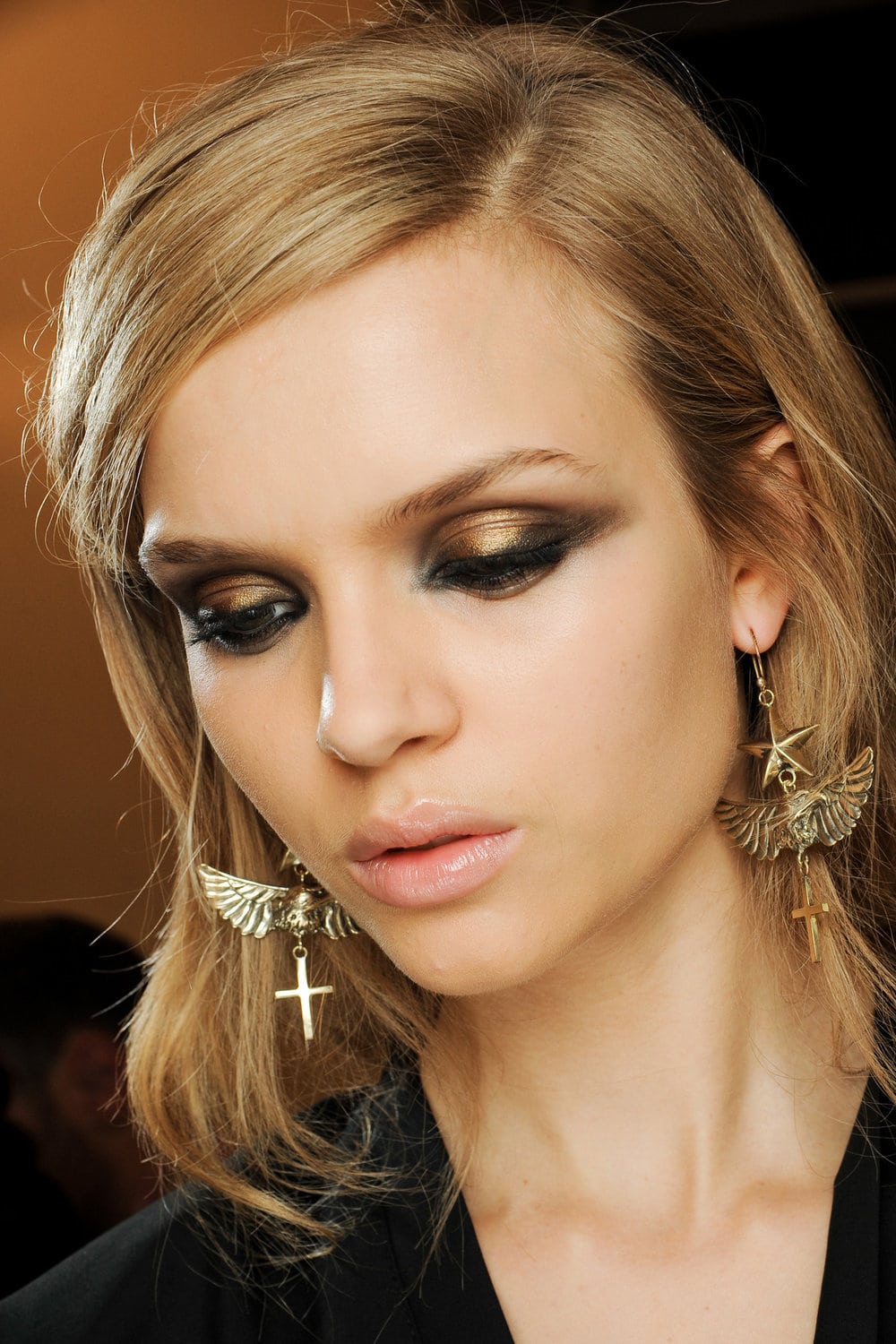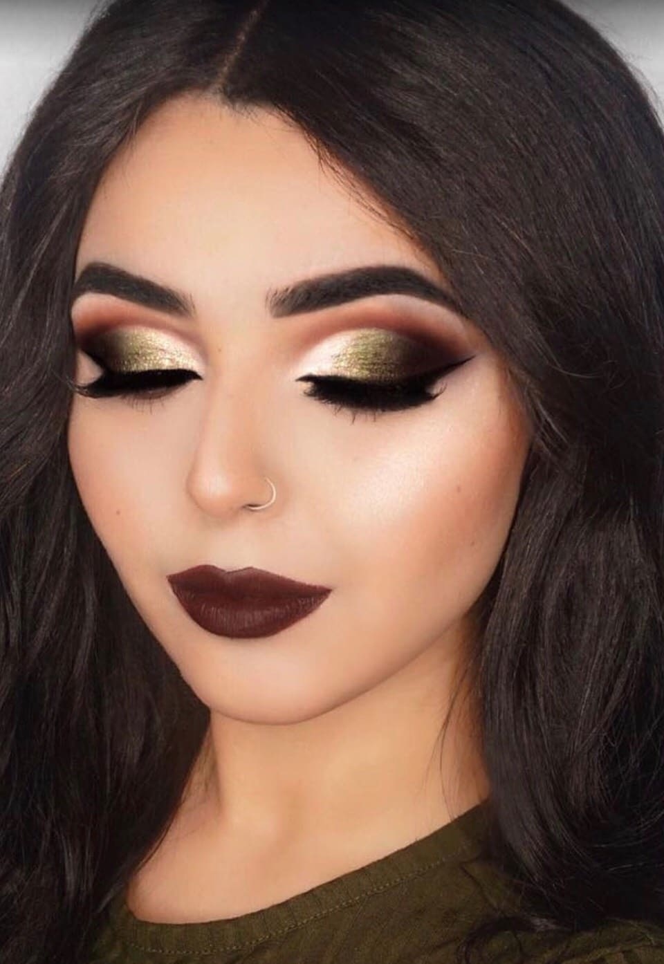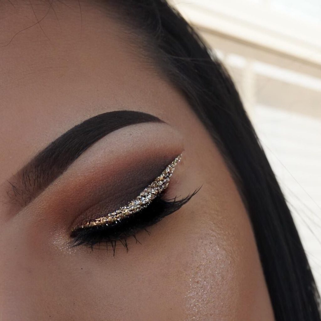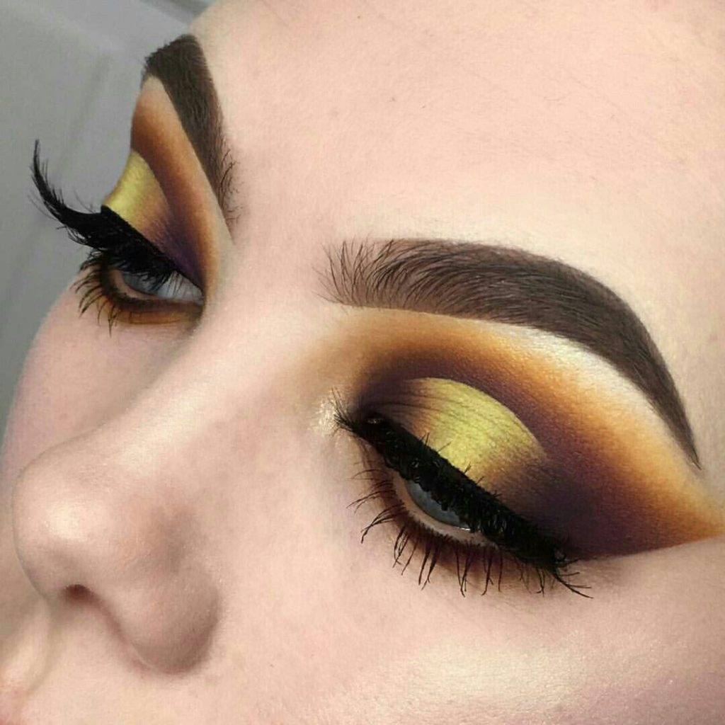Just imagine how to transform “cat's eye” makeup if it is done in gold. So make-up is done with the main gold color, and for the corner use bronze, brown, gray, black. The corner can be made shimer shades or matte.