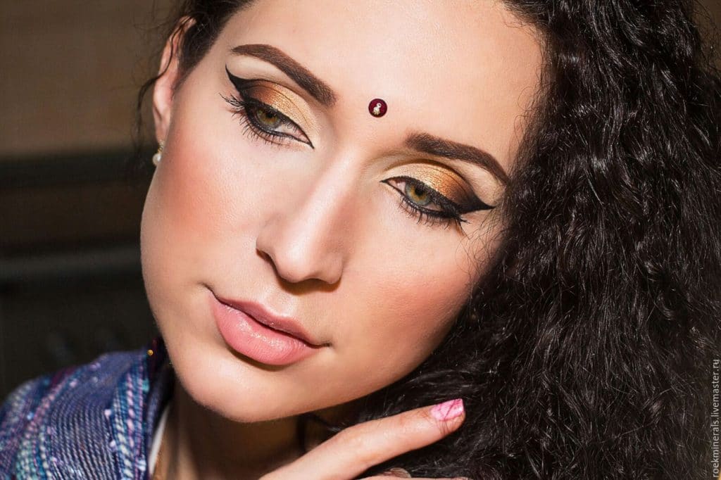 It is difficult to imagine the performance of Arabic makeup without gold shadows. In this makeup, the gold color is applied not only to the moving eyelid, but also under the eyebrow. And of course, the corner is darkened with very dark shades in combination with an arrow from the inner corner of the eye with a rather long tail. Be sure to completely let the inner mucous membrane of the eye.
