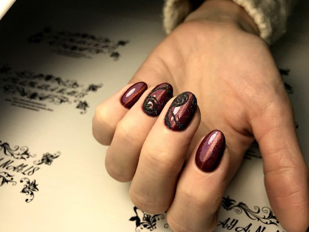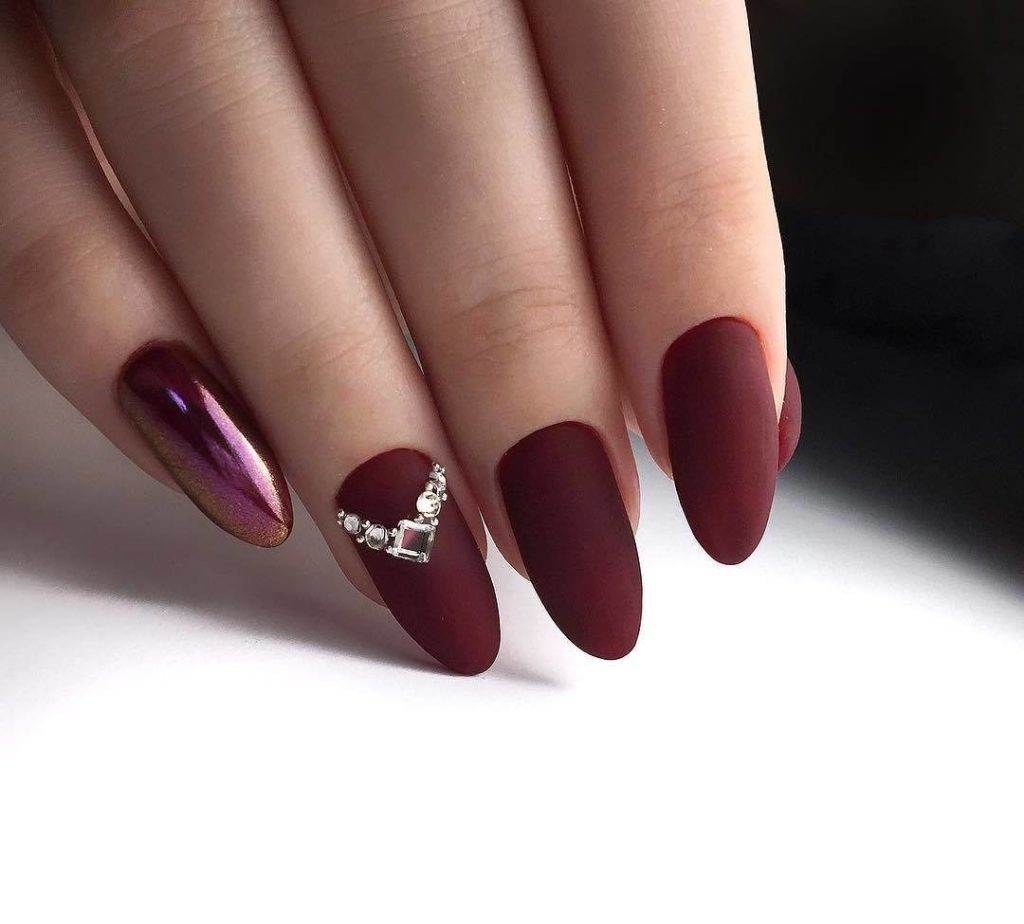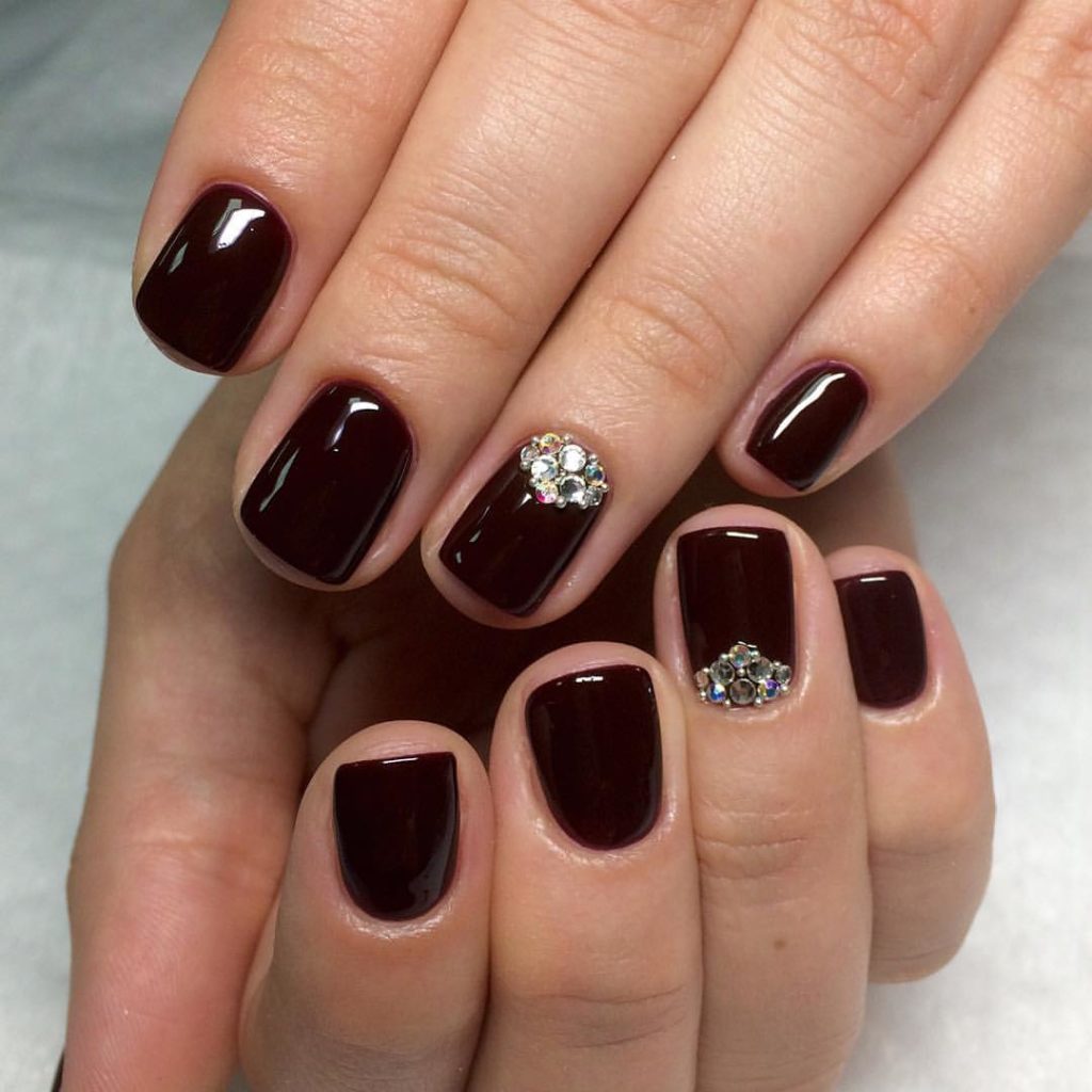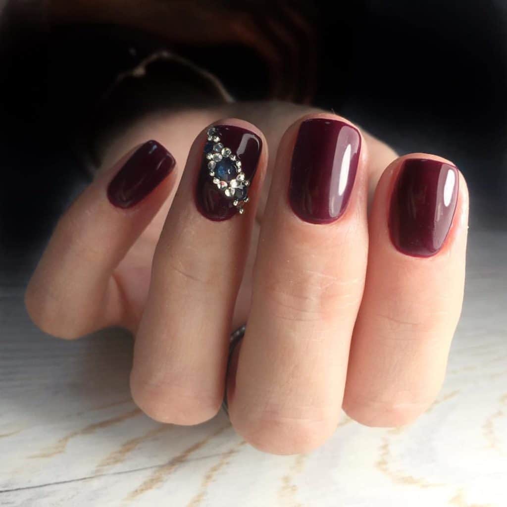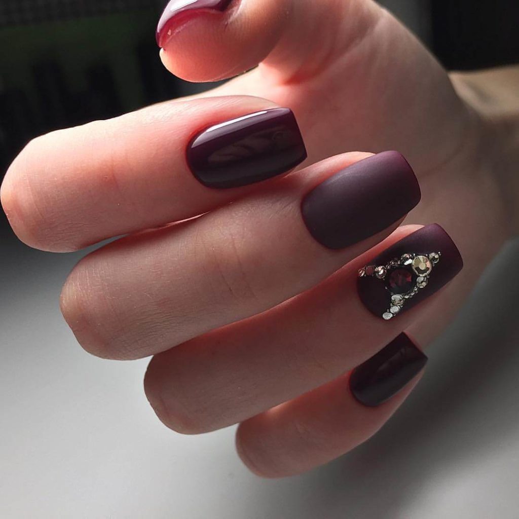 Wine manicure will look stylish not only in the classic version, but also in combination with rhinestones and patterns in gold and other decor options.