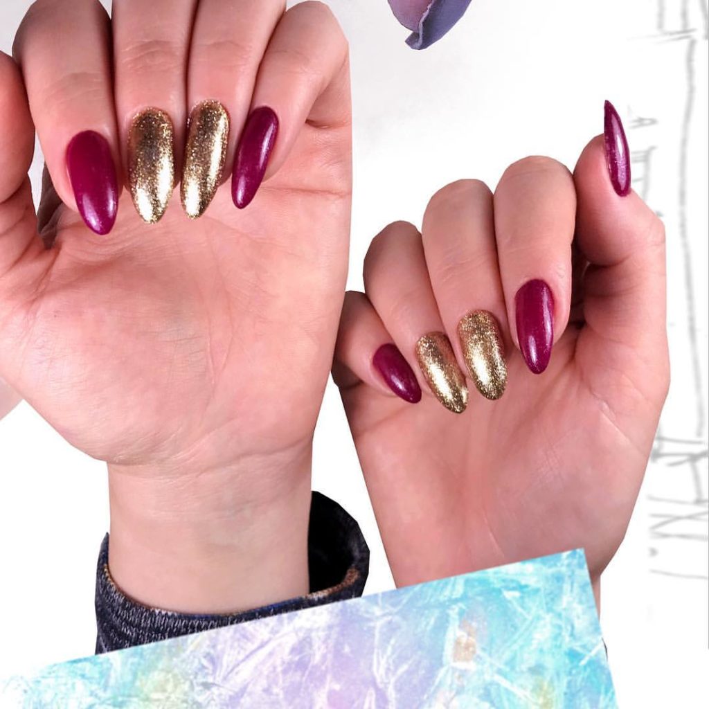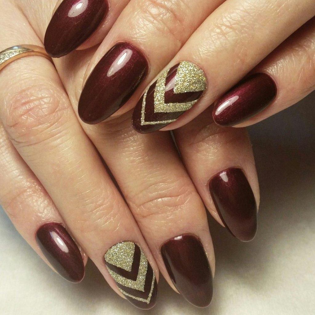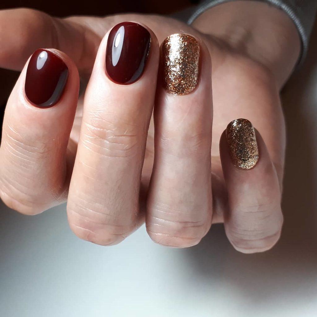 The burgundy shade will look luxurious, additions with a golden decor in this case, gold sequins and a golden rub.