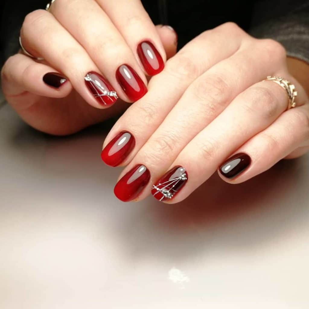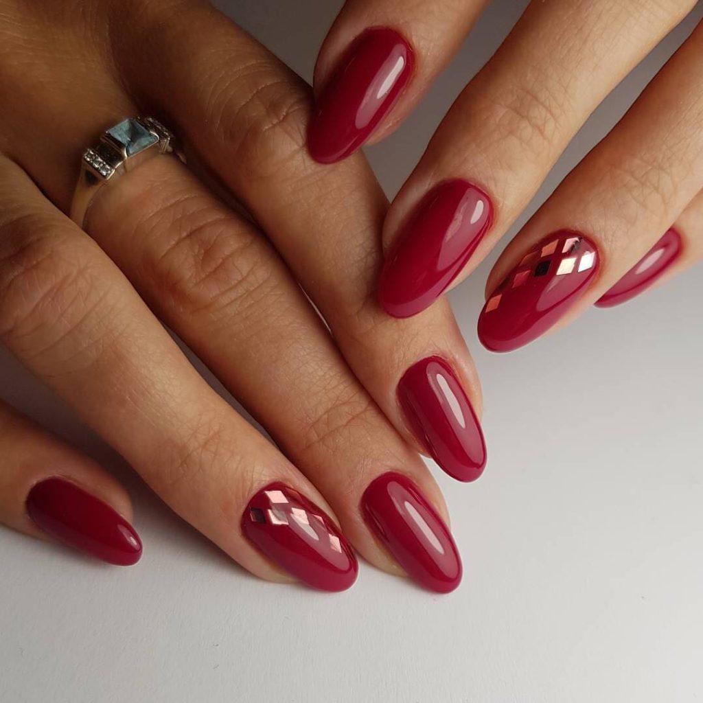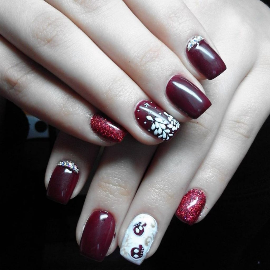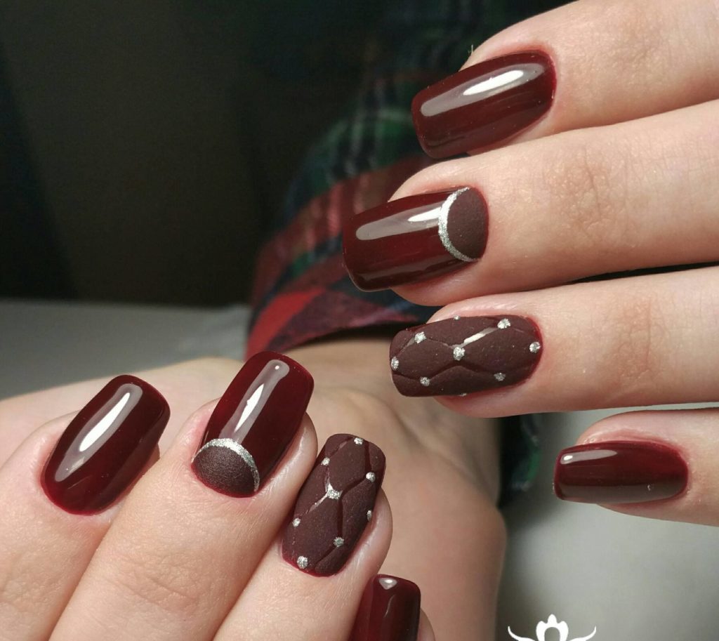 They emphasize the depth of the wine tint. The pattern placed on one or two nails will look harmonious, or cover all nails with a miniature pattern of sparkles.