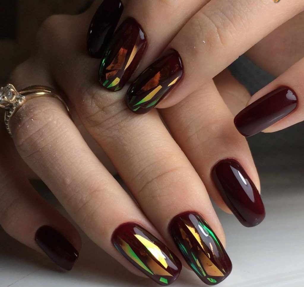 She always looks solemn. In its creation you will be helped by a multi-colored film or foil, as well as stickers. The material is cut into small pieces of different sizes, and attached to the nails in the form of a pattern or randomly. Winning but it looks like a stained glass manicure in a wine style on dark shades.