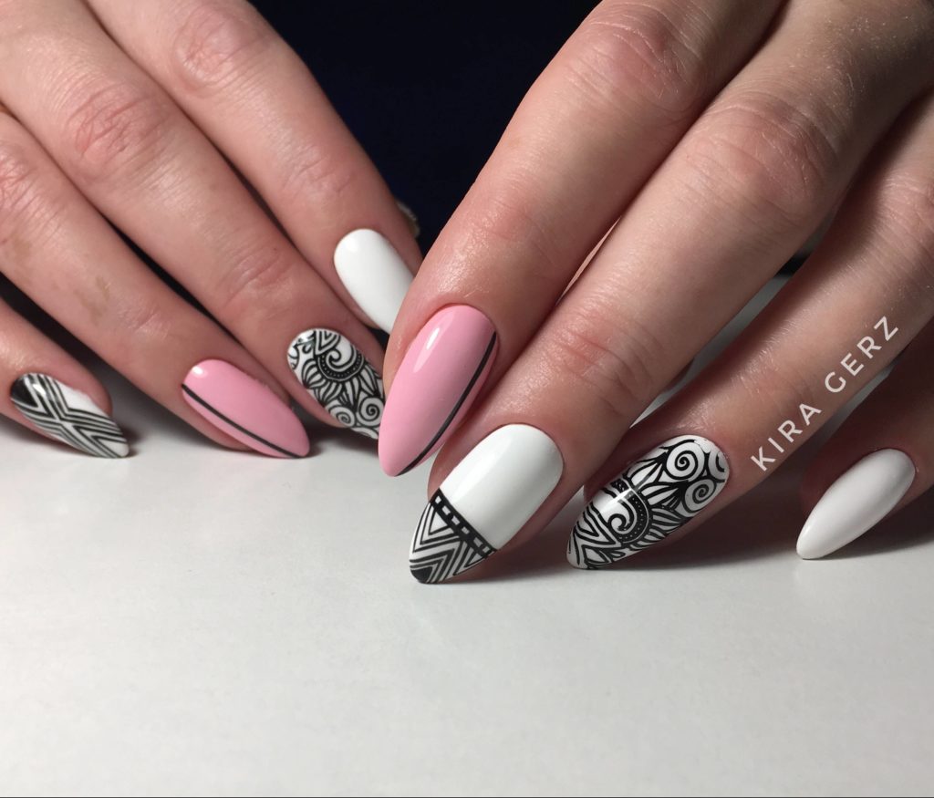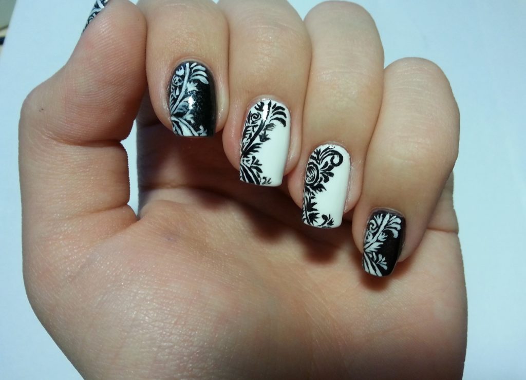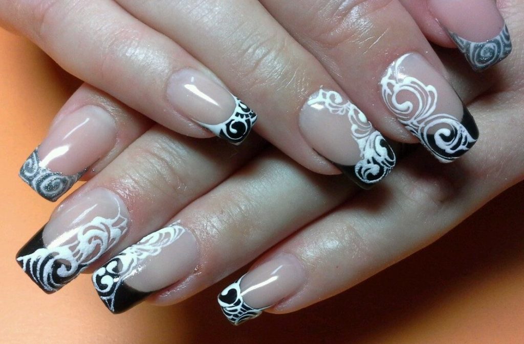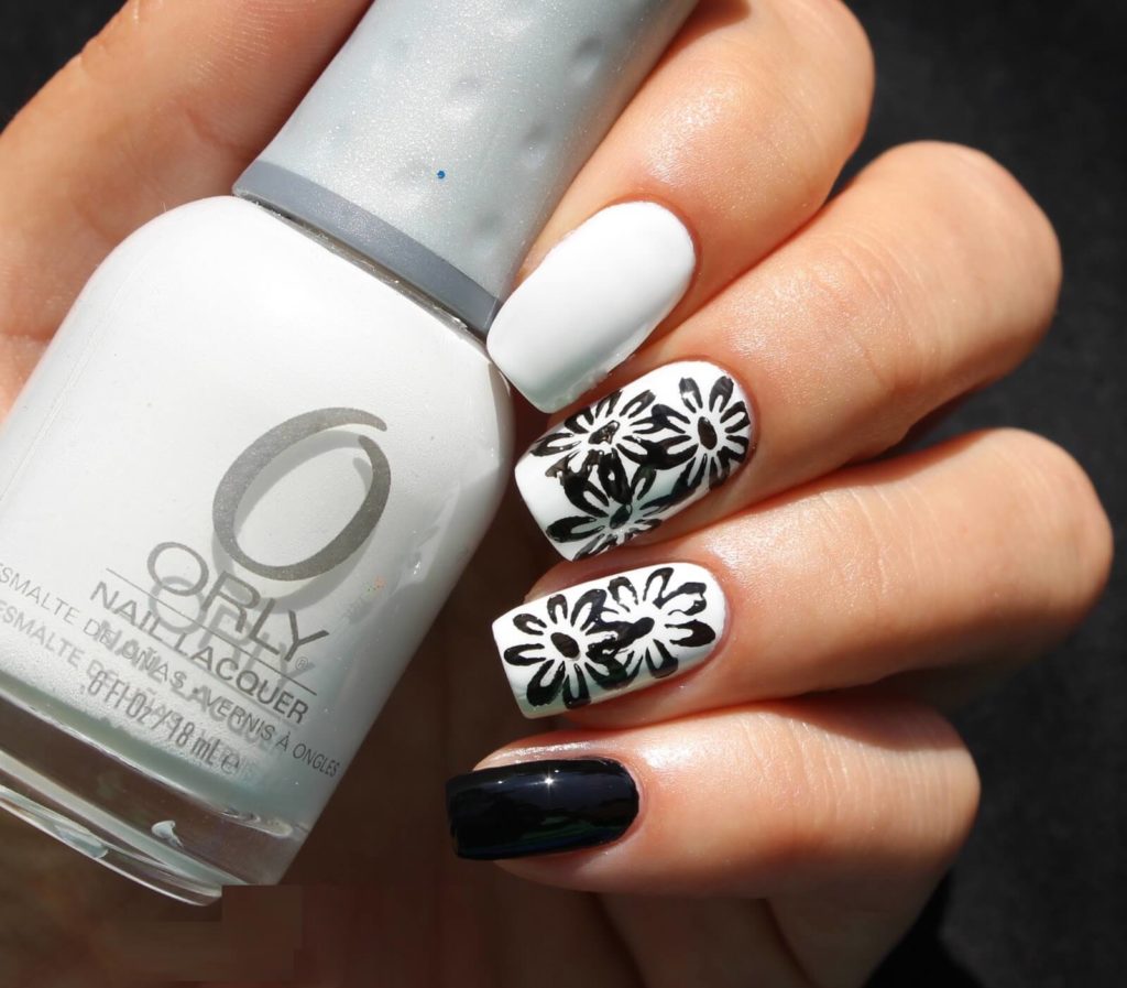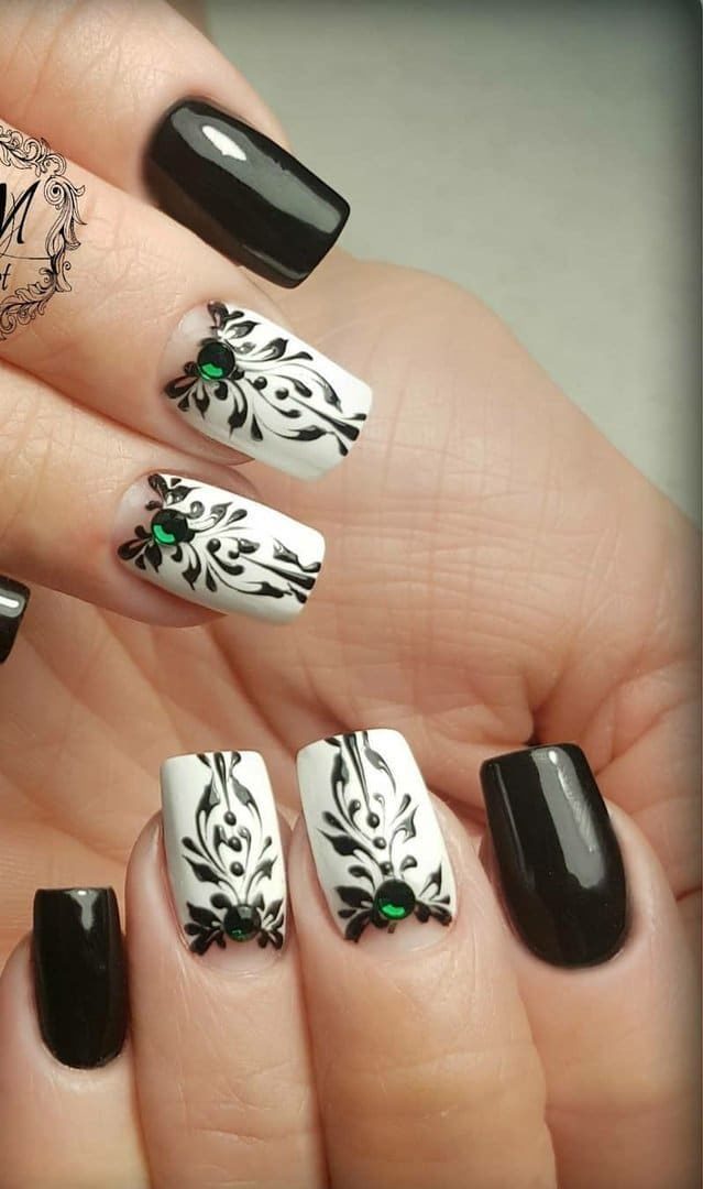 Basically, the most popular choice is to draw patterns in black or white acrylic paint. Because such colors are universal and perfectly match any varnish color. And the stylish solution will be to choose a white varnish, and on top draw black patterns in the form of stems or other patterns. After all, here you can already draw exactly what your imagination tells you.