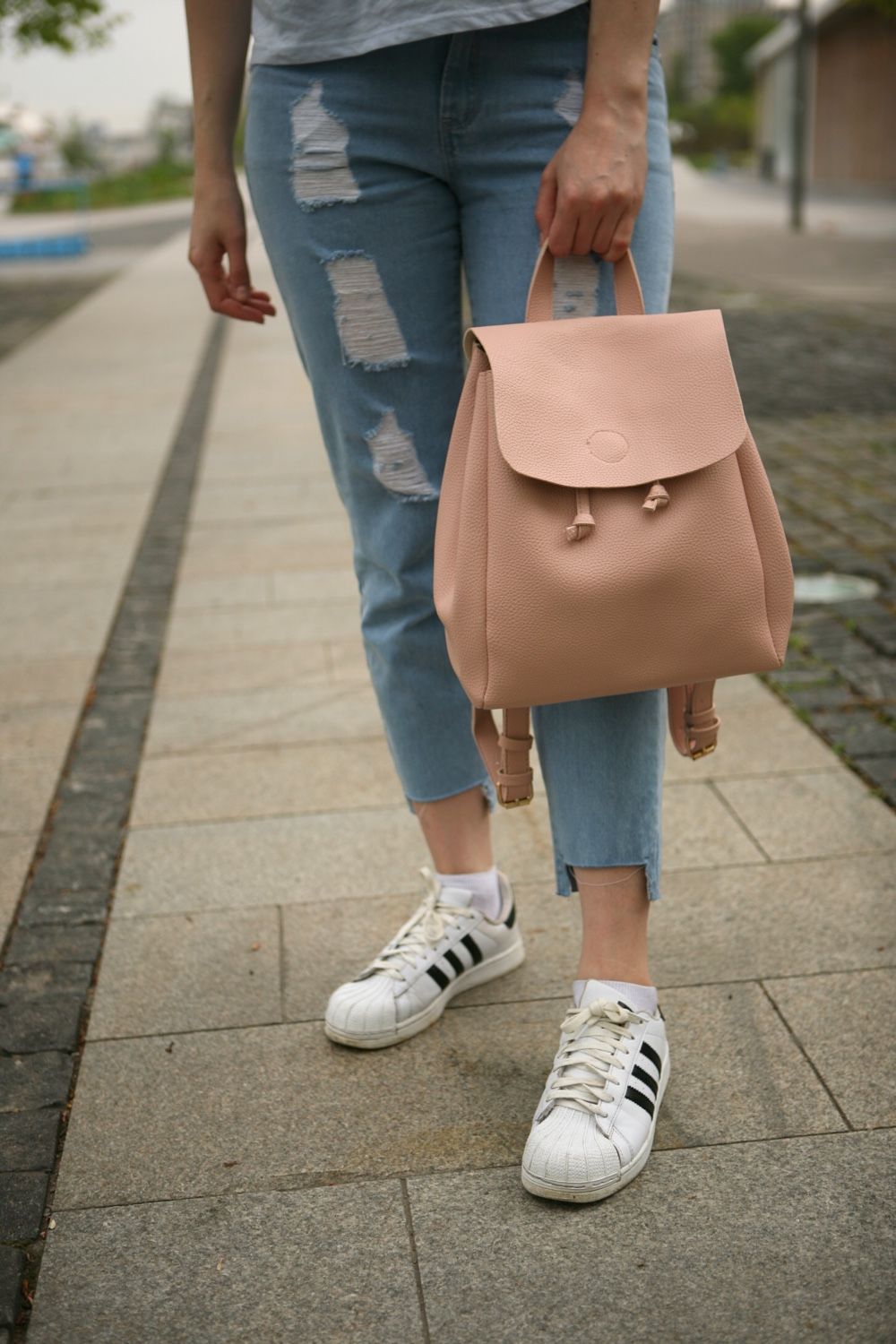 For a casual look, jeans are at your disposal. Under them, you can safely choose a backpack of any shape and color.