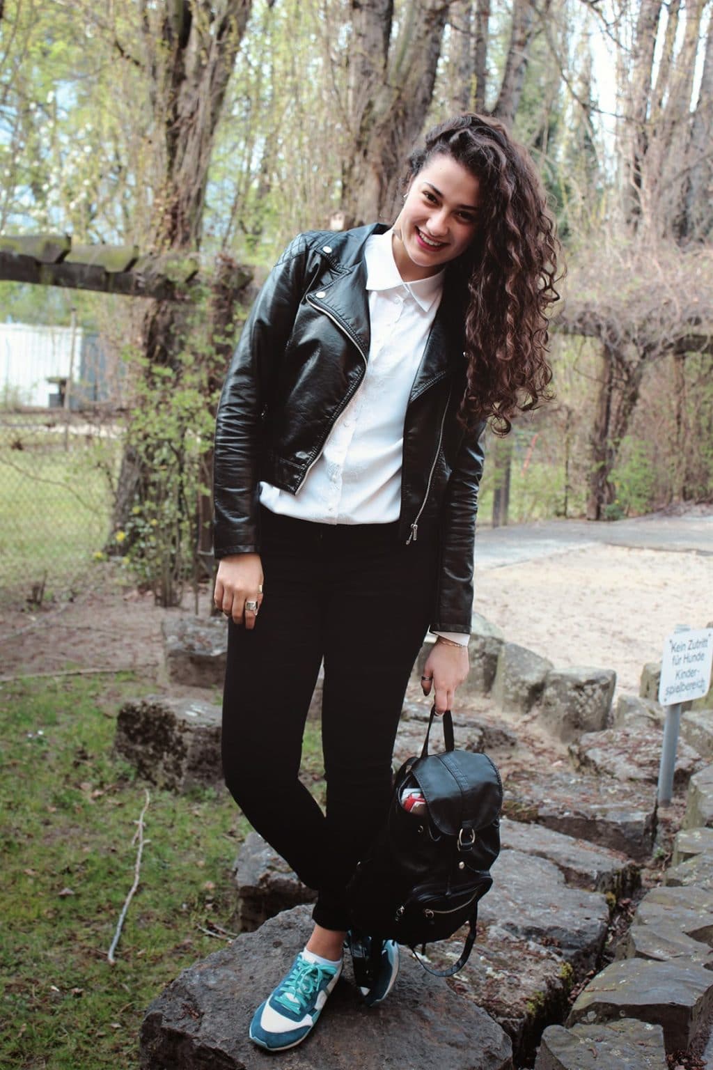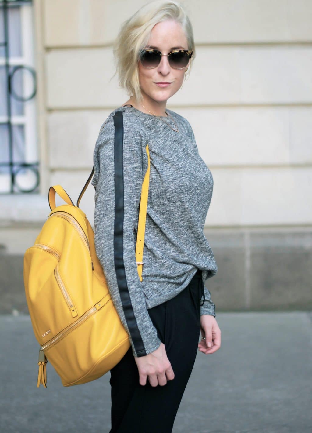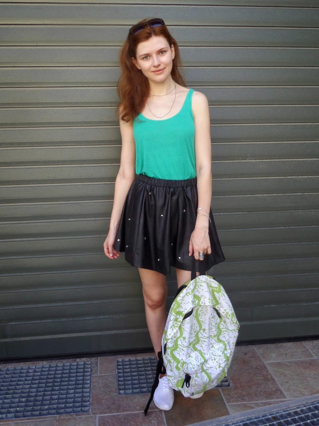 Closer to mid-spring, when you can already wear lighter things, you can safely choose leggings and a black backpack. Also a good color would be to choose burgundy, red, yellow, blue, and light green.