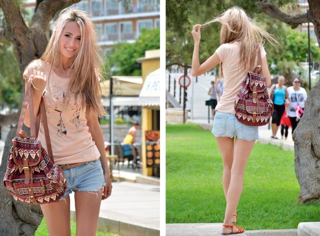 Perhaps the most popular and common type of socks, this is a backpack in combination with summer things. A good choice is to buy a backpack in a floral print. Such a backpack will be a striking attribute of your image, which is appropriate for summer weather. Your clothes are matched to it in a more neutral color. It can be a plain t-shirt and denim shorts. Or a light dress to the knees, without inscriptions. In this combination, select shoes in the color of the backpack itself, which will help create an interesting monochromy.