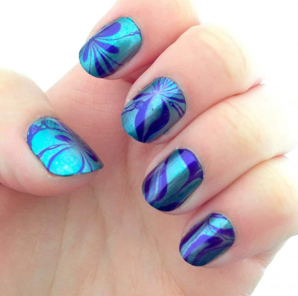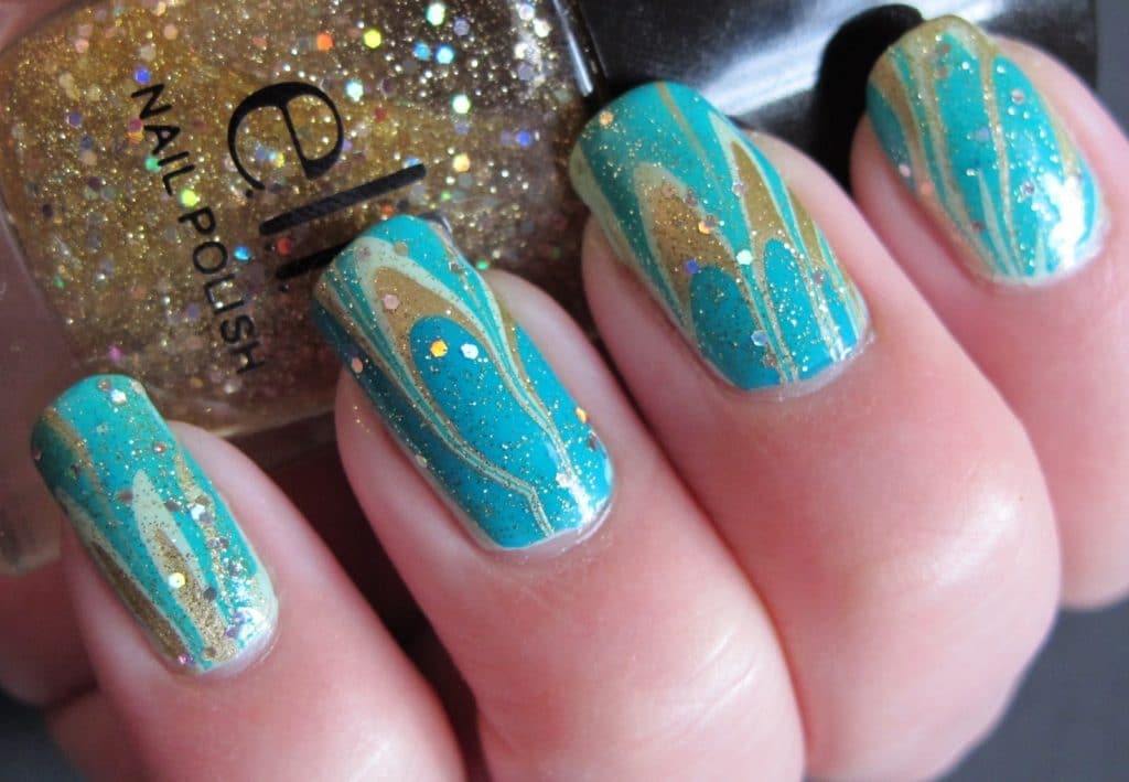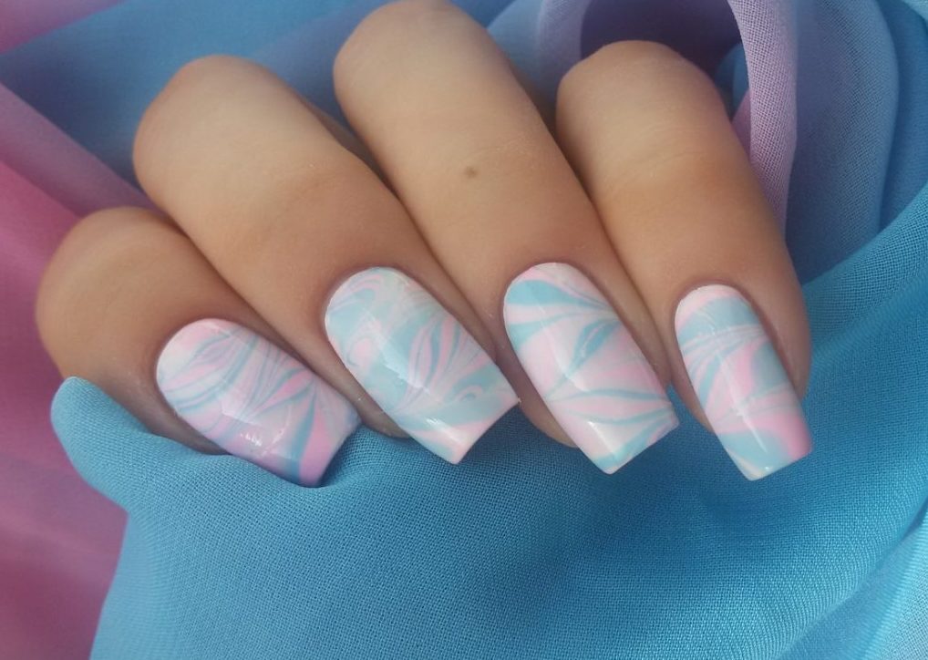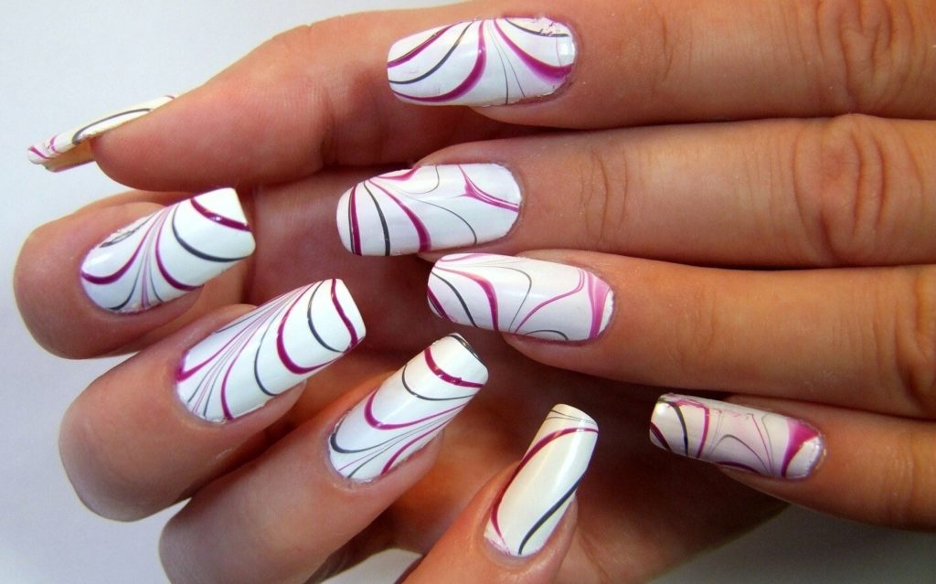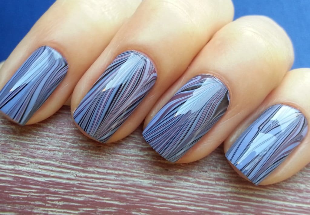 Water manicure combines style, beauty of performance and it will perfectly fit into any holiday or celebration. It also works well on short or long nails.