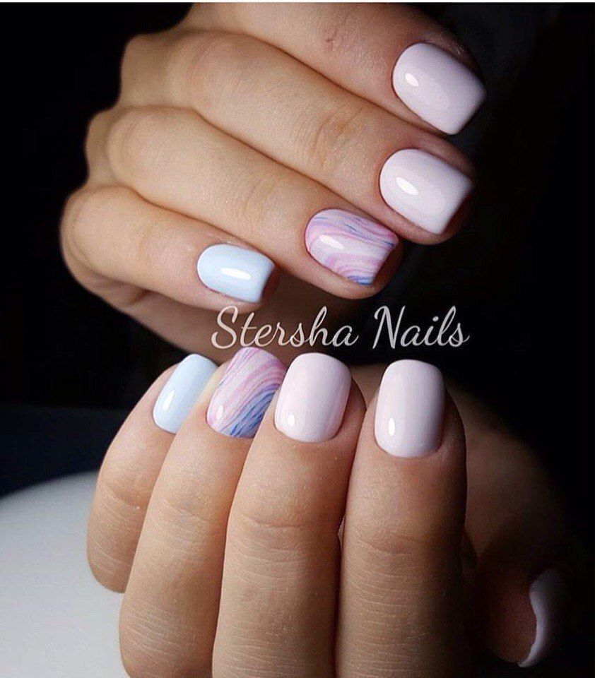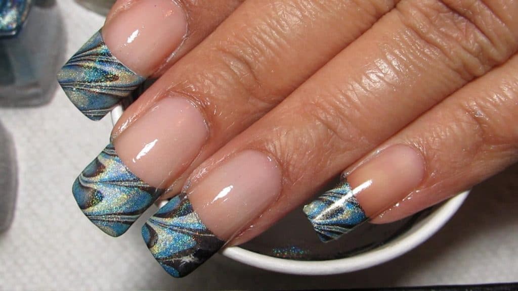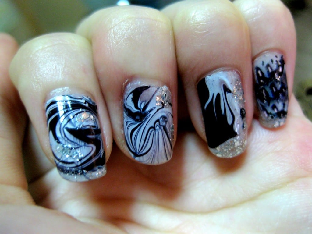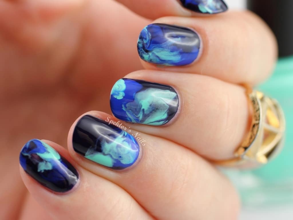 Water manicure combines style, beauty of performance and it will perfectly fit into any holiday or celebration. It also works well on short or long nails.