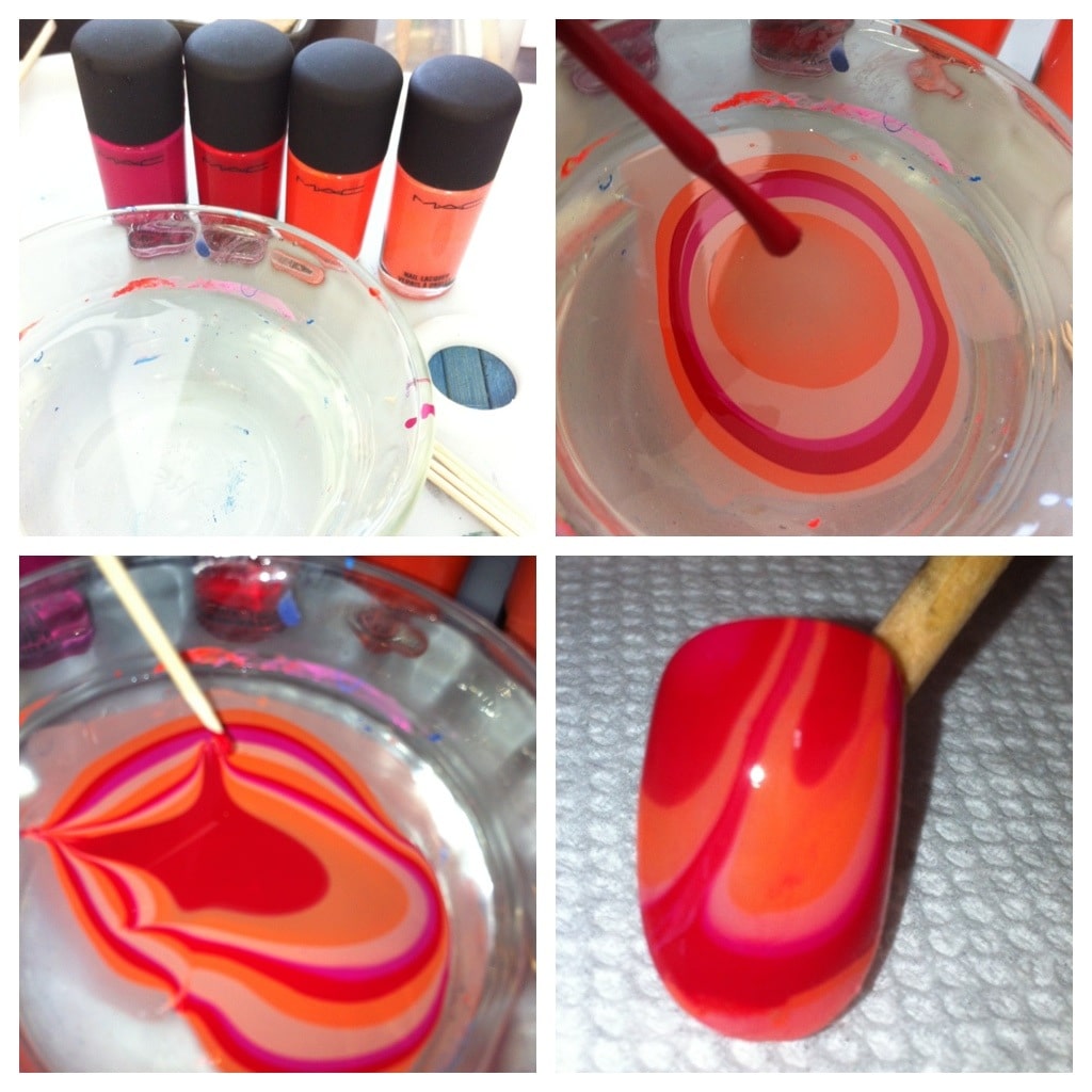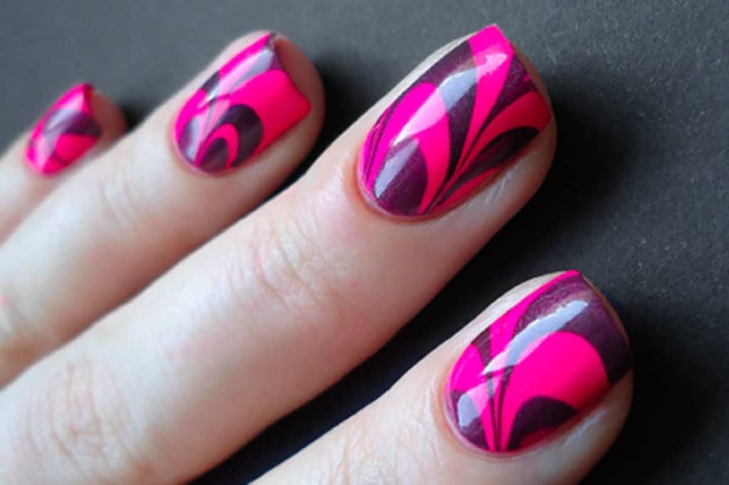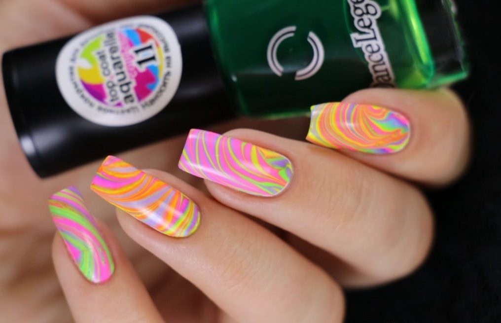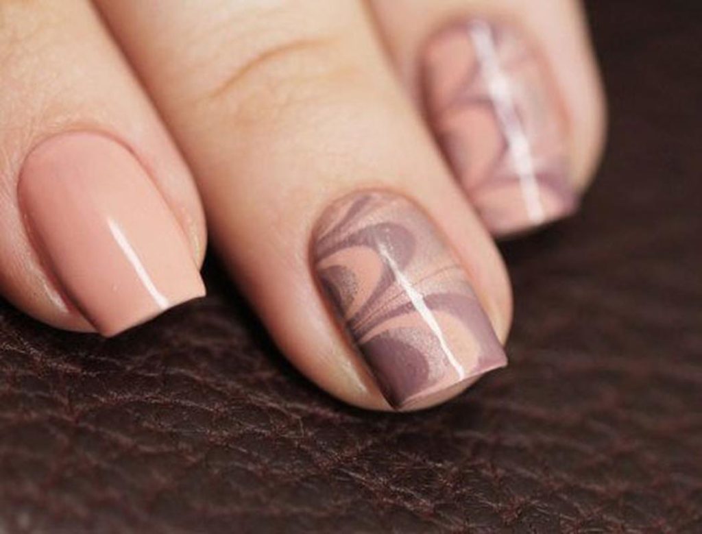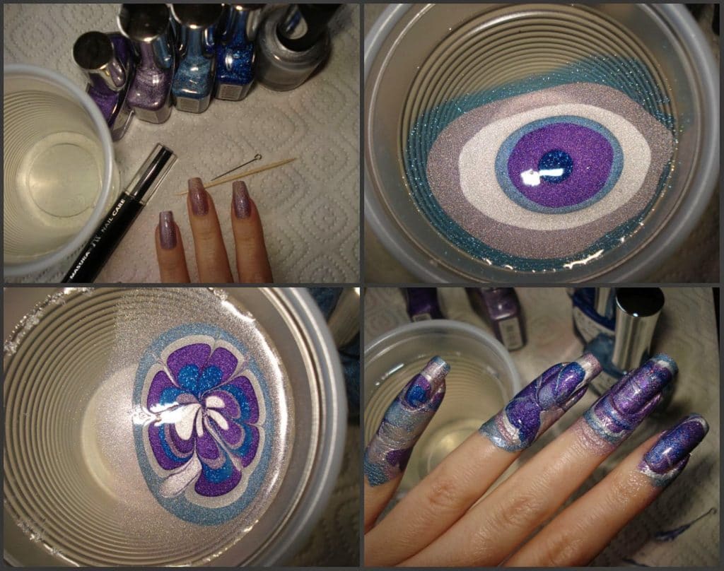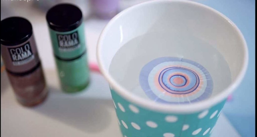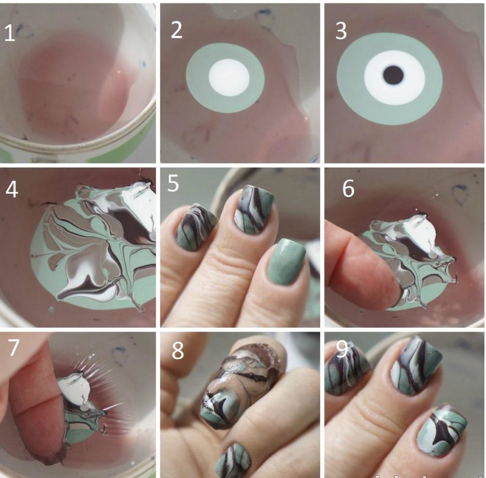 We wrap the finger with tape, leaving the nail itself uncoiled. Then lower the finger perpendicular to the water with varnishes. When you pull out your finger, the entire pattern of colored varnish is imprinted on your nail. Excess varnish is easily removed with acetone. Moisten a cotton swab or sponge with it and gently wipe off any excess.