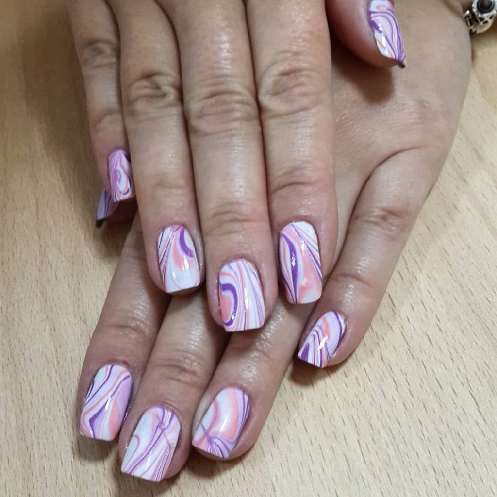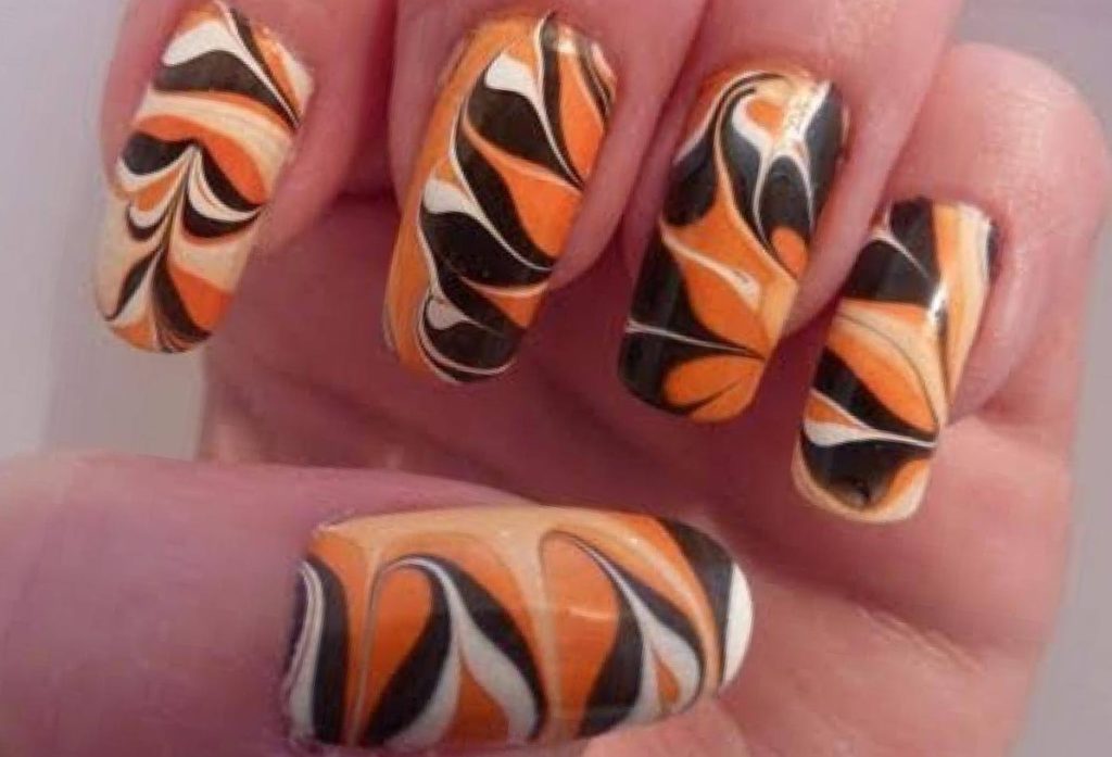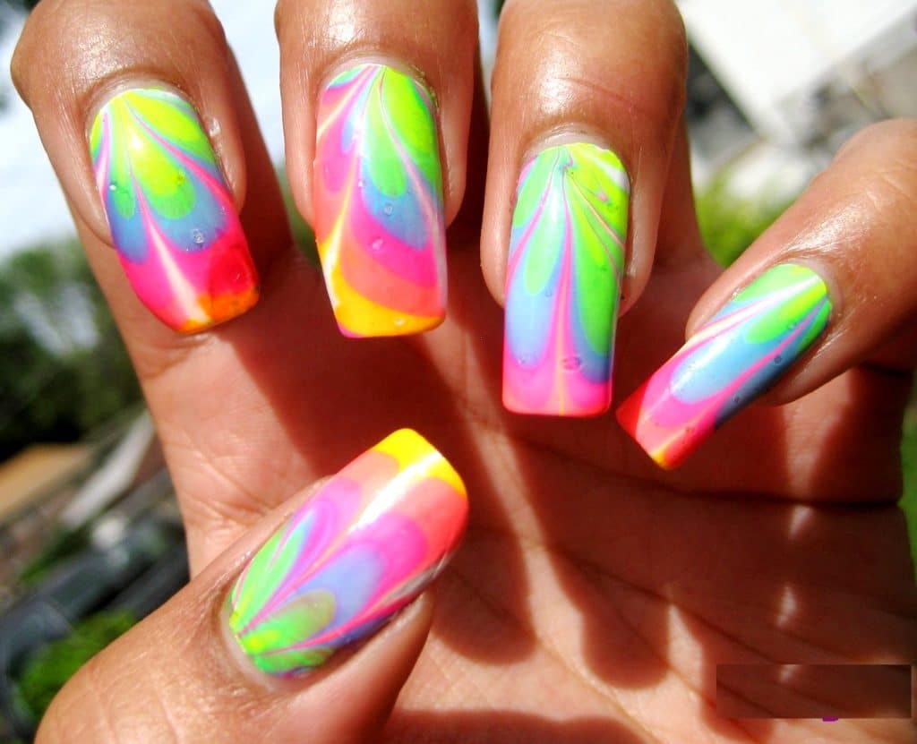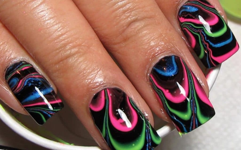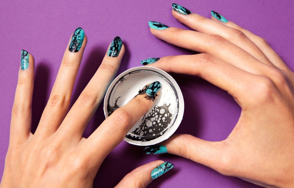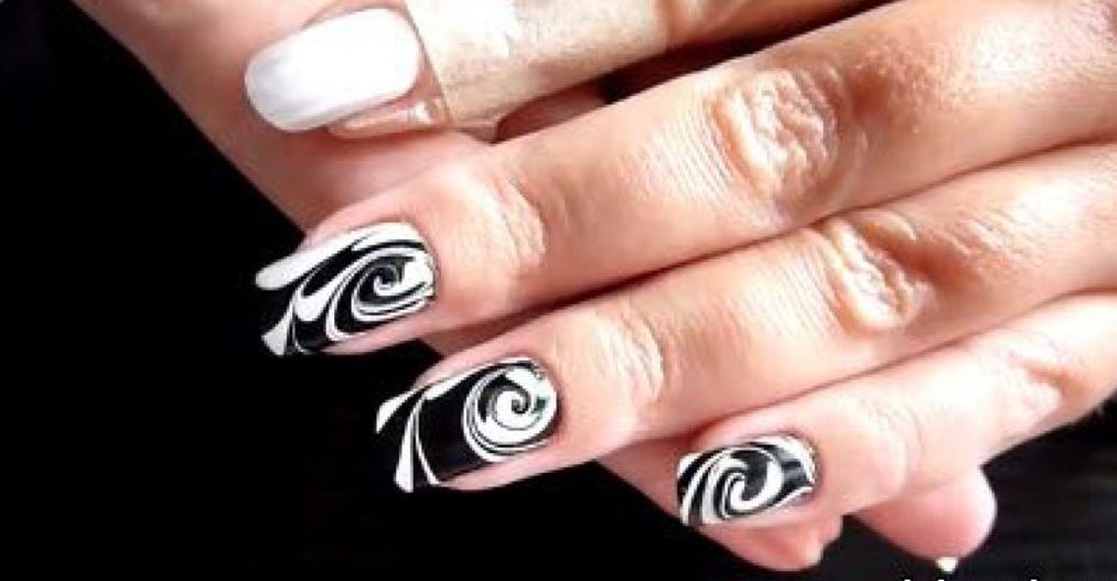 We wrap the finger with tape, leaving the nail itself uncoiled. Then lower the finger perpendicular to the water with varnishes. When you pull out your finger, the entire pattern of colored varnish is imprinted on your nail. Excess varnish is easily removed with acetone. Moisten a cotton swab or sponge with it and gently wipe off any excess.