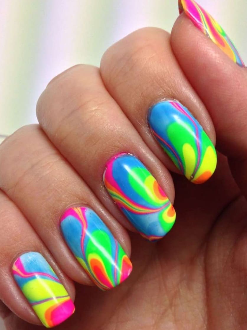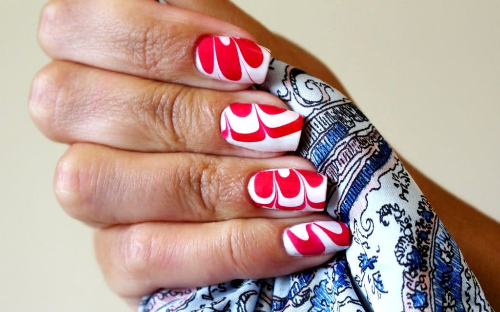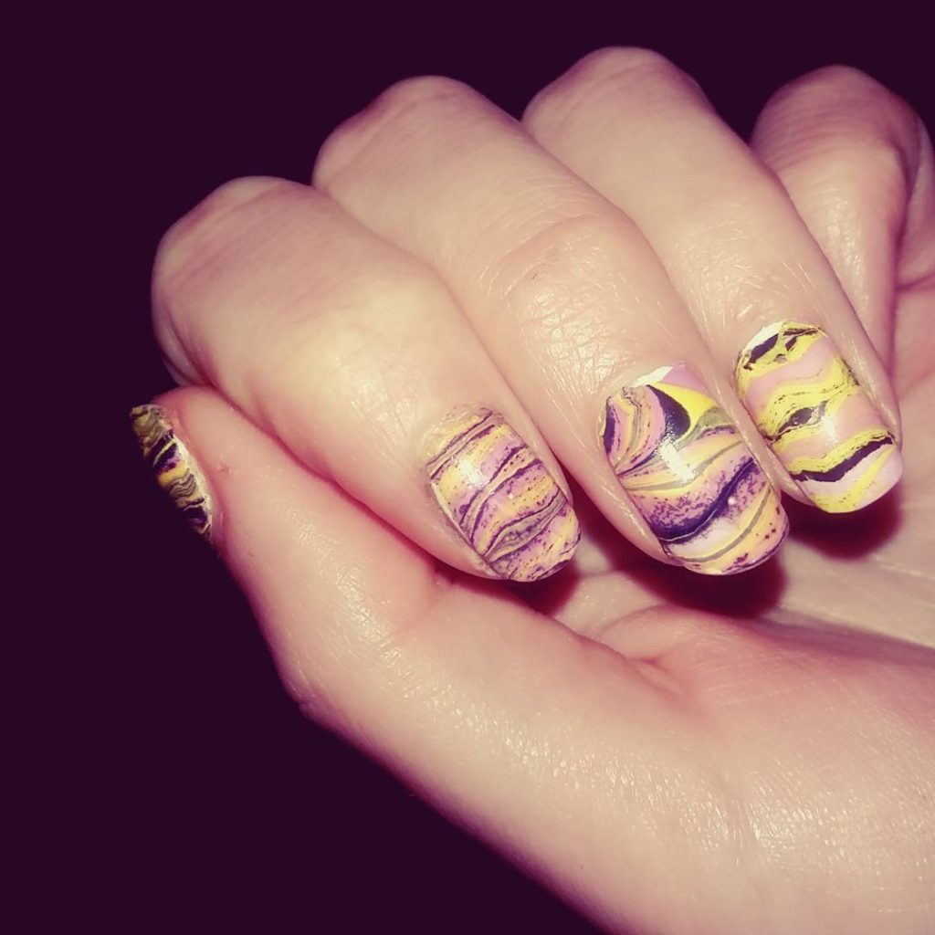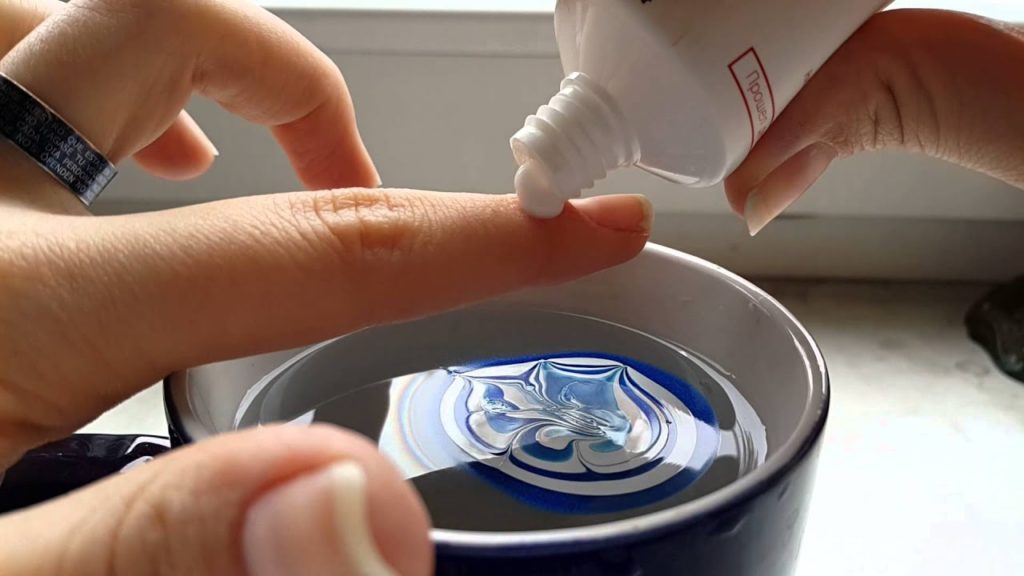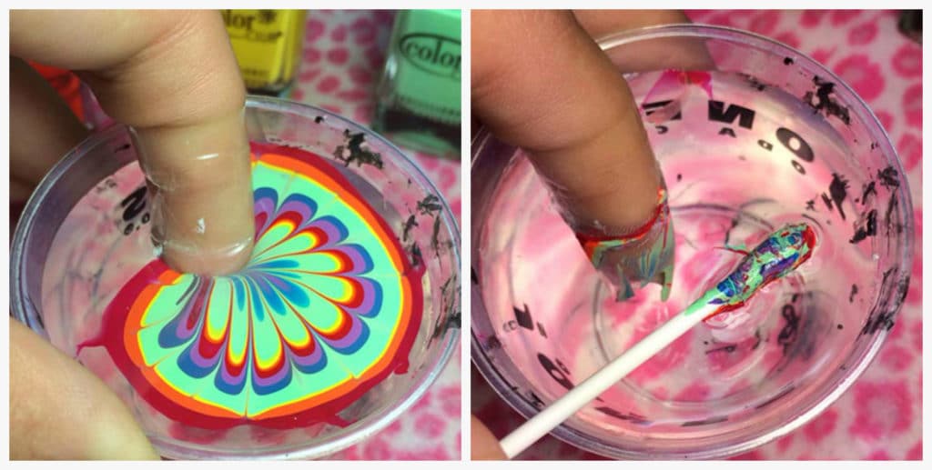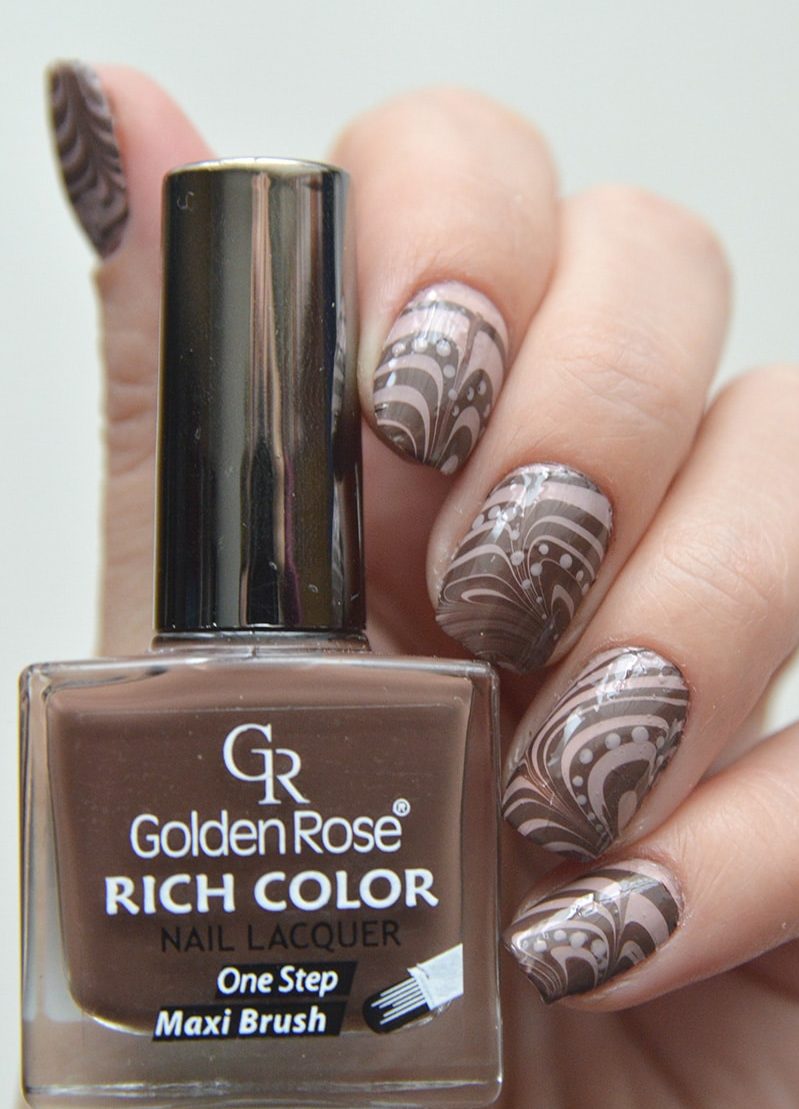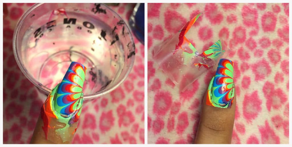 We wrap the finger with tape, leaving the nail itself uncoiled. Then lower the finger perpendicular to the water with varnishes. When you pull out your finger, the entire pattern of colored varnish is imprinted on your nail. Excess varnish is easily removed with acetone. Moisten a cotton swab or sponge with it and gently wipe off any excess.