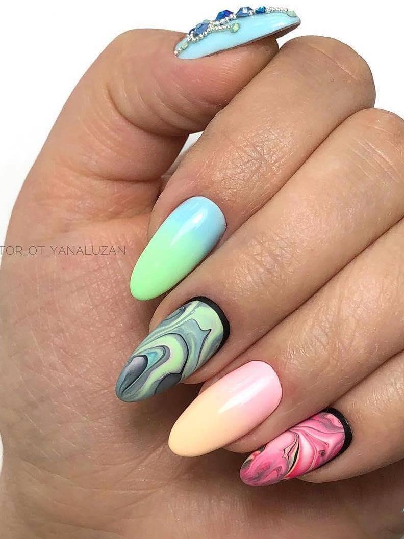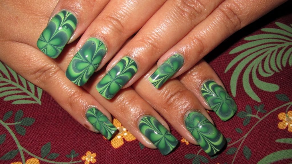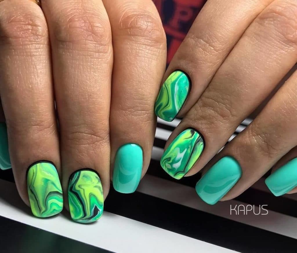 The plain look of a water manicure includes those colors that are not too bright or multi-colored. In fact, these are the colors that match the shades of each other. For example, one green color may be light, another dark. Also with other colors.