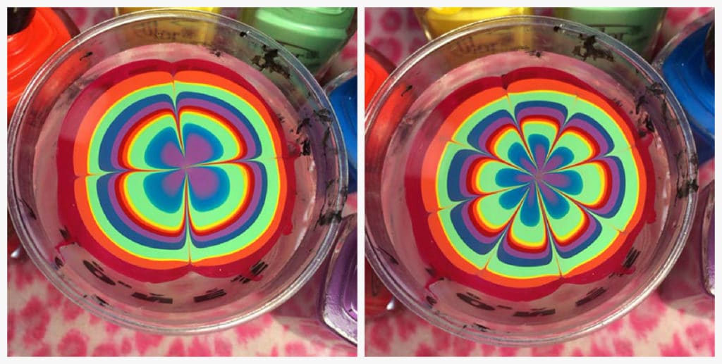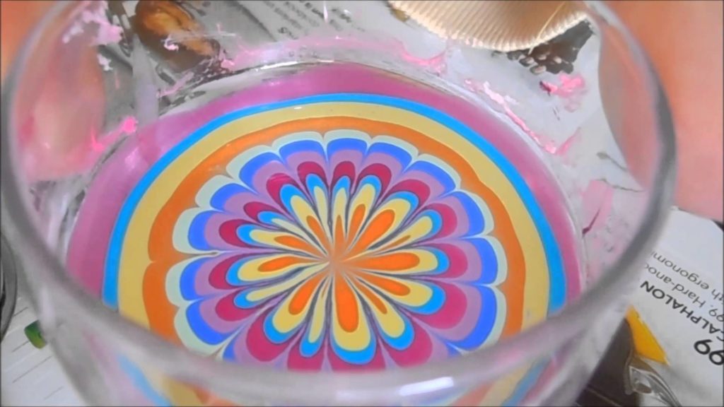 We put the first varnish in a glass of water and wait until it spreads over the water. Then we take another colored varnish and drip into the center of the former varnish. We repeat, these are not tricky actions until there is enough space in the glass itself for different circles of varnish. It can be three layers, four, five or six.