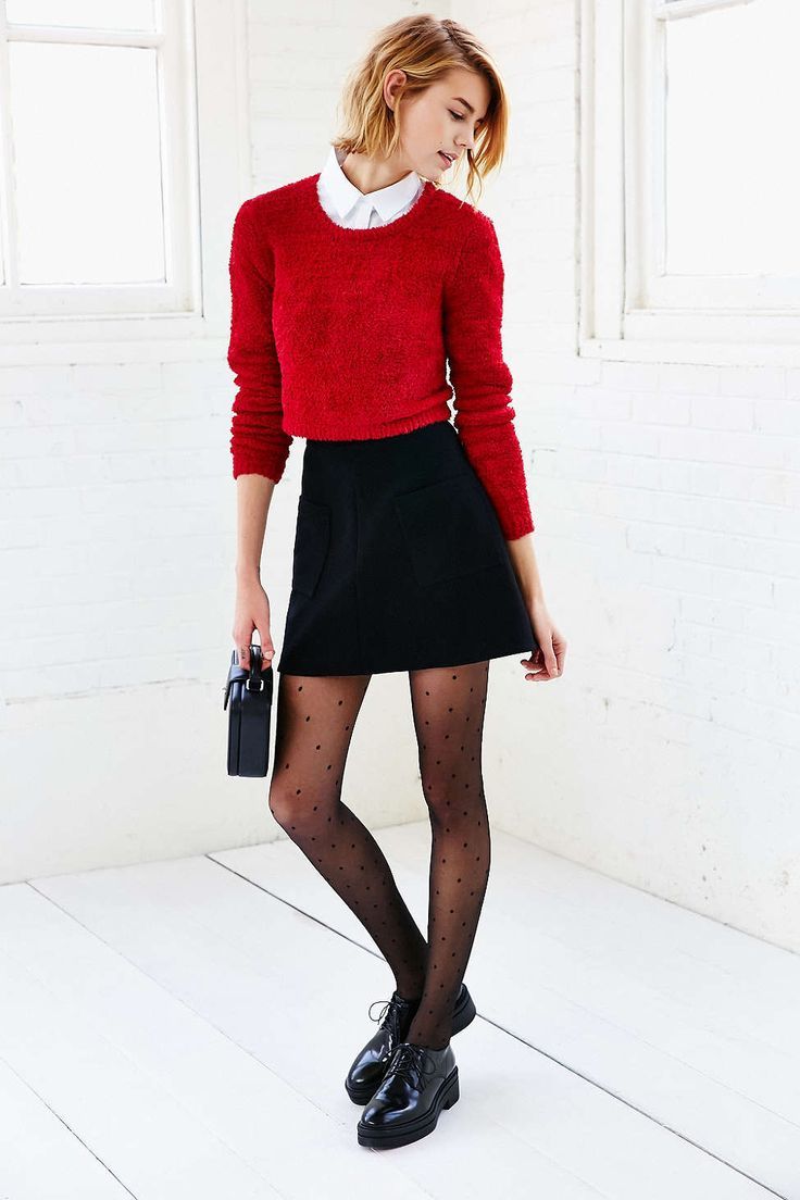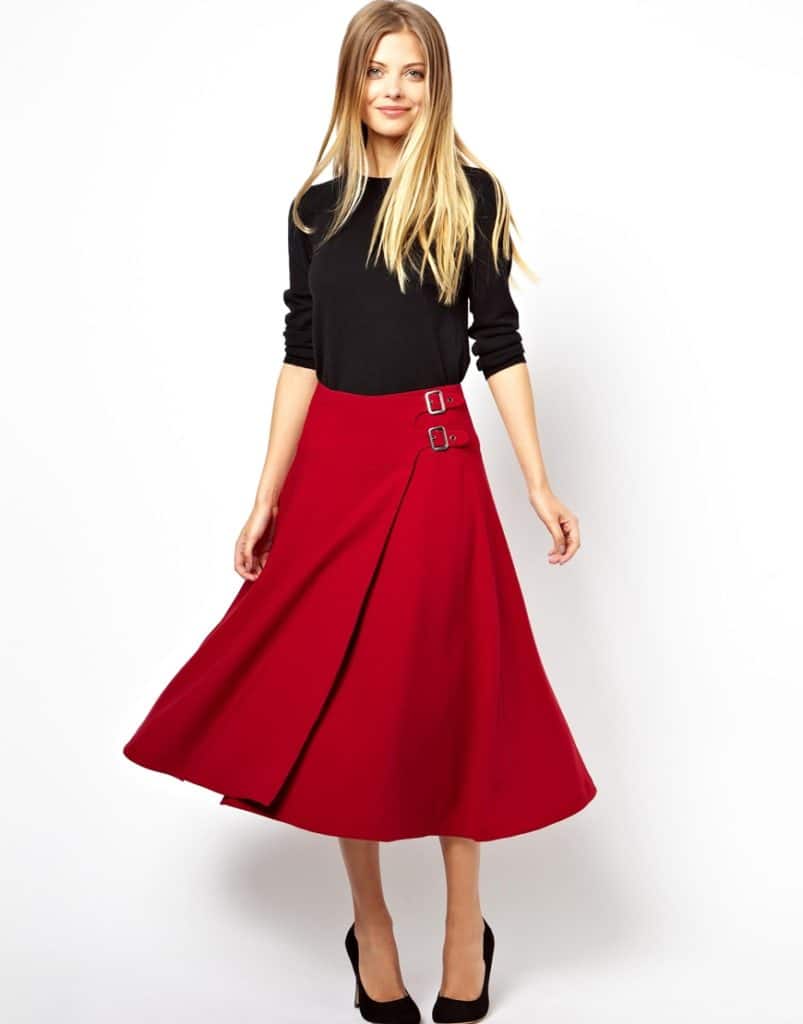 Here the most interesting thing is that you can experiment with the color scheme. You can create a gentle romantic by choosing light, pastel tones of the skirt and your top. A cheeky romantic style will help you achieve things in a dark, black color under tall suede boots. And the image of the fatal beauty is easily achieved through a red skirt, a-line or a red blouse.